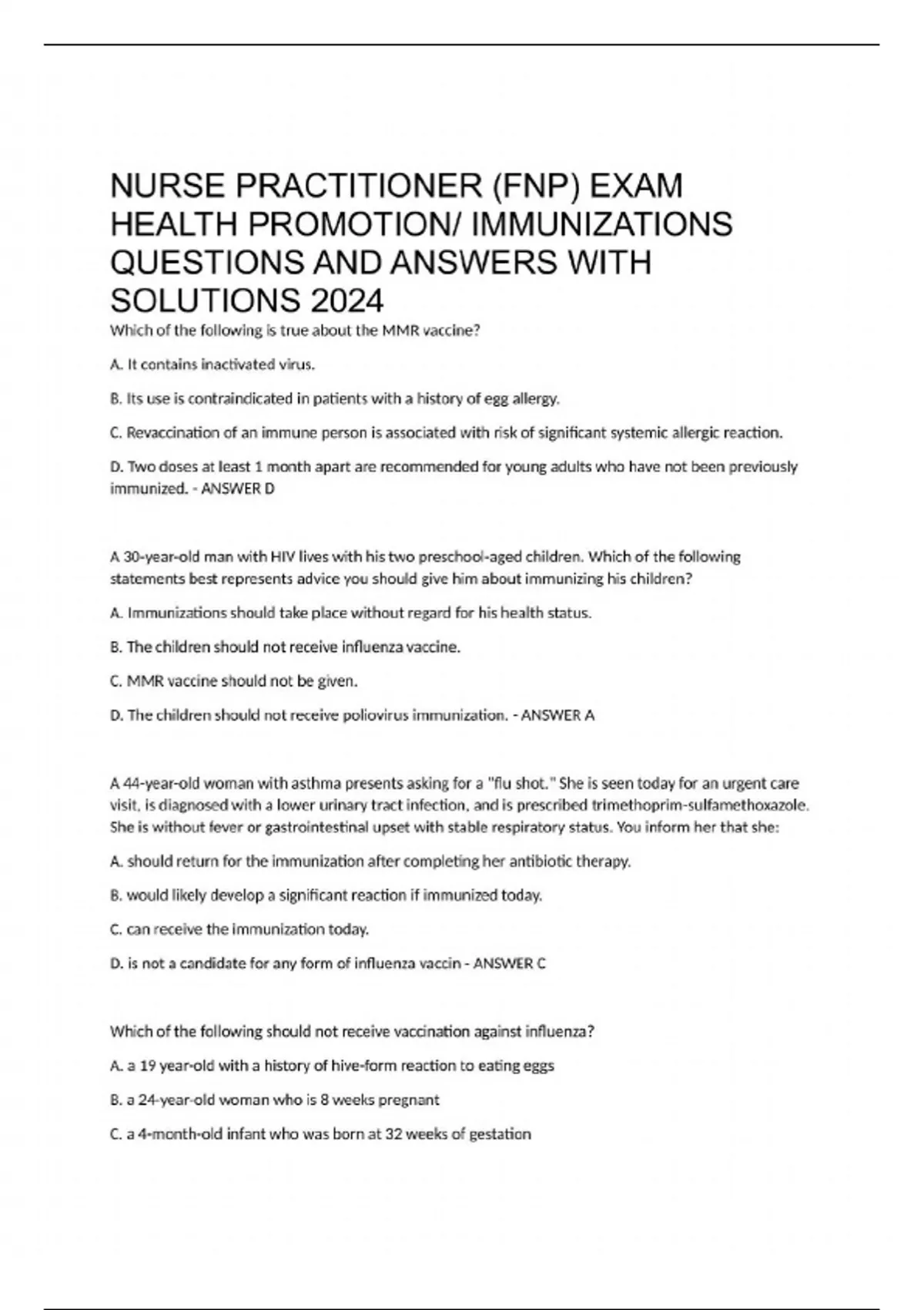 NURSE PRACTITIONER (FNP) EXAM HEALTH PROMOTION/ IMMUNIZATIONS QUESTIONS AND ANSWERS WITH SOLUTIONS 2024 Which of the following is true about the MMR vaccine? A. It contains inactivated virus. B. Its use is contraindicated in patients with a history of egg allergy. C. Revaccination of an immune person is associated with risk of significant systemic allergic reaction. D. Two doses at least 1 month apart are recommended for young adults who have not been previously immunized. - ANSWER D A 30-year-old man with HIV lives with his two preschool-aged children. Which of the following statements best represents advice you should give him about immunizing his children? A. Immunizations should take place without regard for his health status. B. The children should not receive influenza vaccine. C. MMR vaccine should not be given. D. The children should not receive poliovirus immunization. - ANSWER A A 44-year-old woman with asthma presents asking for a "flu shot." She is seen today for an urgent care visit, is diagnosed with a lower urinary tract infection, and is prescribed trimethoprim-sulfamethoxazole. She is without fever or gastrointestinal upset with stable respiratory status. You inform her that she: A. should return for the immunization after completing her antibiotic therapy. B. would likely develop a significant reaction if immunized today. C. can receive the immunization today. D. is not a candidate for any form of influenza vaccin - ANSWER C Which of the following should not receive vaccination against influenza? A. a 19 year-old with a history of hive-form reaction to eating eggs B. a 24-year-old woman who is 8 weeks pregnant C. a 4-month-old infant who was born at 32 weeks of gestation D. a 28-year-old woman who is breastfeeding a 2 week old. - ANSWER C You see a 48-year-old patient who started taking varenicline (Chantix) 4 weeks ago to aid in smoking cessation. Which of the following is the most important question to ask during today's visit? A. "How many cigarettes a day are you currently smoking?" B. "On a scale of 0 to 10, how strong is your desire to smoke?" C. "Have you noticed any changes in your mood?" D. "Are you having any trouble sleeping?" - ANSWER C Active immunity is defined as: A. resistance developed in response to an antigen. B. immunity conferred by an antibody produced in another host. C. the resistance of a group to an infectious agent. D. defense against disease acquired naturally by the infant from the mother. - ANSWER A Influenza protection options for a 62-year-old man with hypertension, dyslipidemia, and type 2 diabetes mellitus include receiving: A. live attenuated influenza vaccine via nasal spray. B. high-dose trivalent inactivated vaccine (TIV) via intramuscular injection C. trivalent inactivated vaccine (TIV) in standard dose via intramuscular injection. D. appropriate antiviral medication as the initial onset of influenza-like illness. - ANSWER C Usual treatment for an adult with acute hepatitis A includes: A. interferon-alfa therapy. B. high-dose ribavirin. C. parenteral acyclovir. D. supportive care - ANSWER D