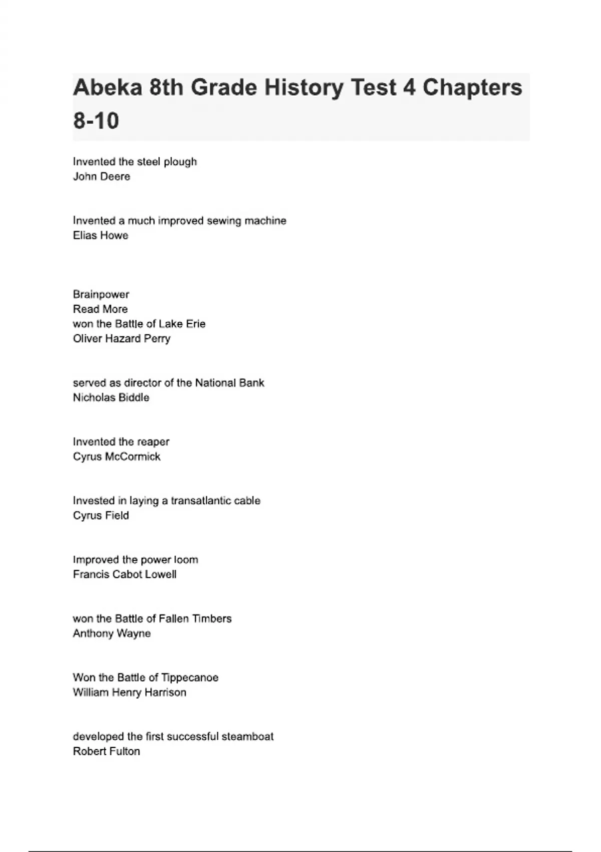 Abeka 8th Grade History Test 4 Chapters 8-10