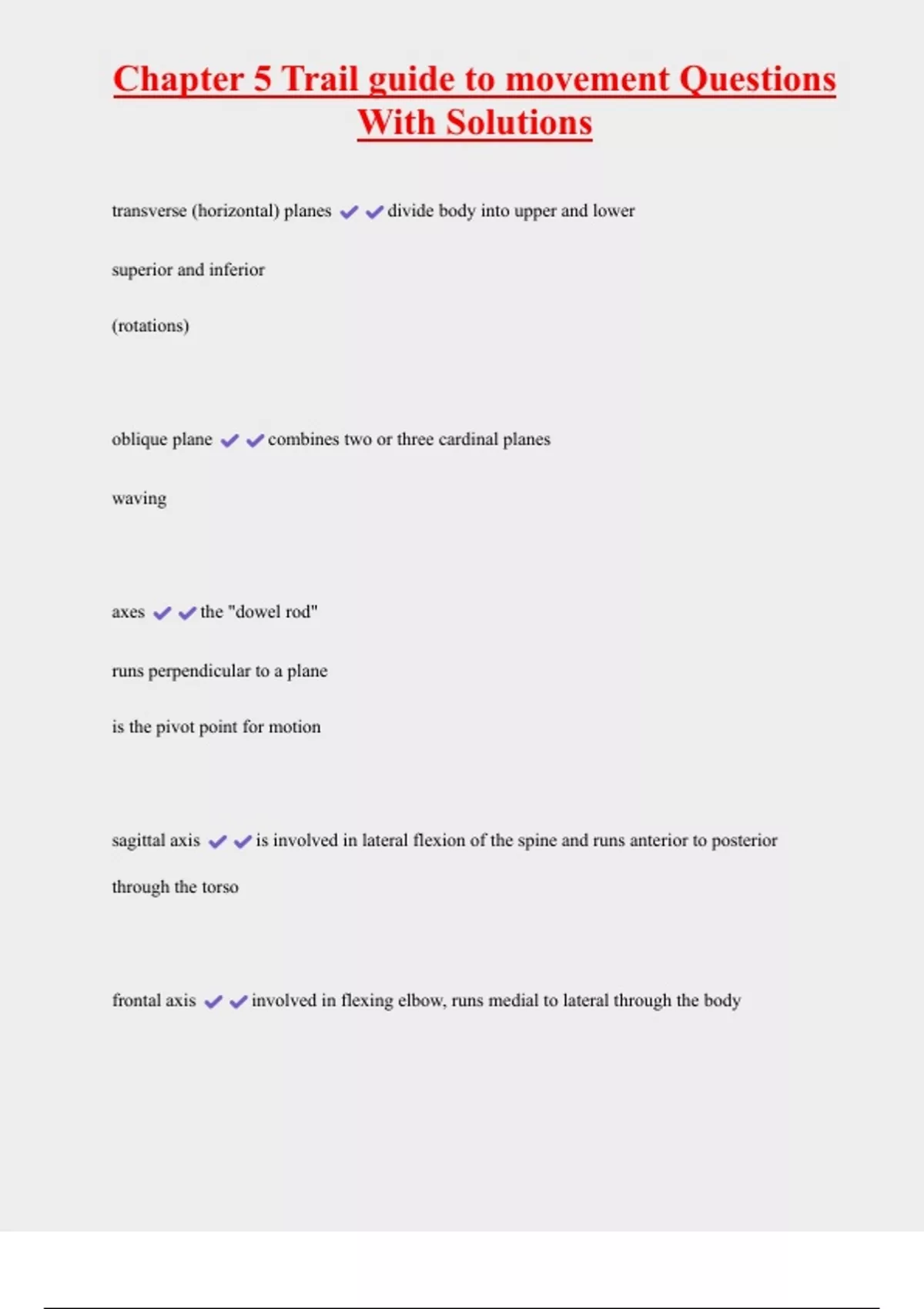Chapter 5 Trail guide to movement Questions With Solutions transverse (horizontal) planes divide body into upper and lower superior and inferior (rotations) oblique plane combines two or three cardinal planes waving