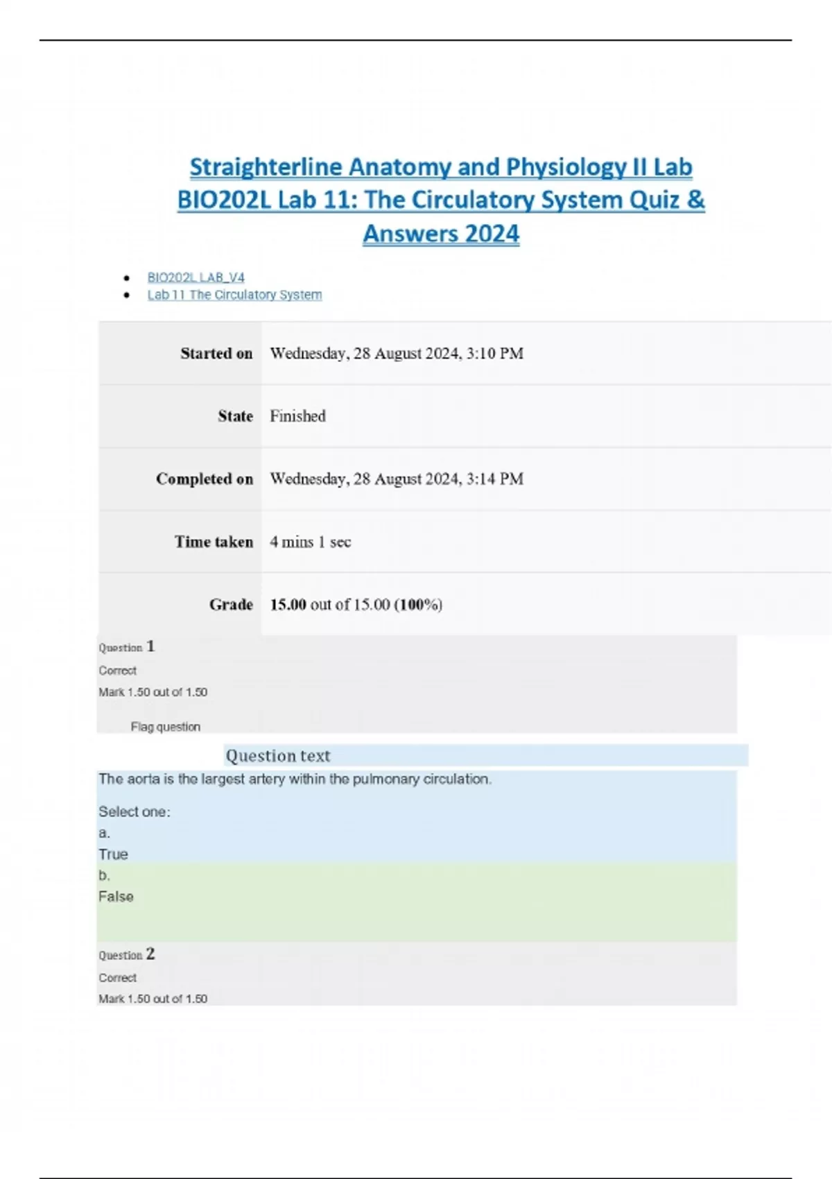 Straighterline Anatomy and Physiology II Lab BIO202L Lab 11: The Circulatory System Quiz & Answers 2024