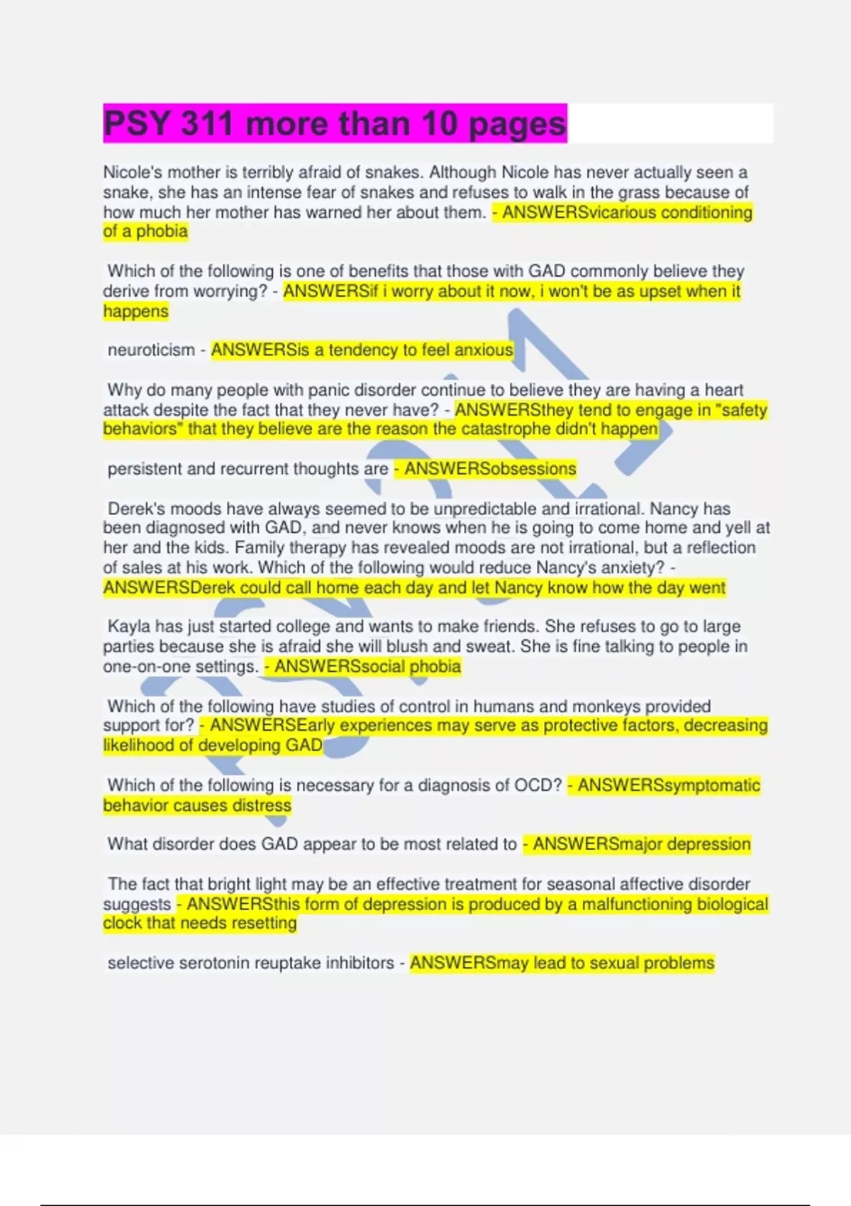 PSY 311 more than 10 pages Nicole's mother is terribly afraid of snakes. Although Nicole has never actually seen a snake, she has an intense fear of snakes and refuses to walk in the grass because of how much her mother has warned her about them. - ANSWERSvicarious conditioning of a phobia Which of the following is one of benefits that those with GAD commonly believe they derive from worrying? - ANSWERSif i worry about it now, i won't be as upset when it happens neuroticism - ANSWERSis a tendency to feel anxious Why do many people with panic disorder continue to believe they are having a heart attack despite the fact that they never have? - ANSWERSthey tend to engage in "safety behaviors" that they believe are the reason the catastrophe didn't happen persistent and recurrent thoughts are - ANSWERSobsessions Derek's moods have always seemed to be unpredictable and irrational. Nancy has been diagnosed with GAD, and never knows when he is going to come home and yell at her and the kids. Family therapy has revealed moods are not irrational, but a reflection of sales at his work. Which of the following would reduce Nancy's anxiety? - ANSWERSDerek could call home each day and let Nancy know how the day went Kayla has just started college and wants to make friends. She refuses to go to large parties because she is afraid she will blush and sweat. She is fine talking to people in one-on-one settings. - ANSWERSsocial phobia Which of the following have studies of control in humans and monkeys provided support for? - ANSWERSEarly experiences may serve as protective factors, decreasing likelihood of developing GAD Which of the following is necessary for a diagnosis of OCD? - ANSWERSsymptomatic behavior causes distress What disorder does GAD appear to be most related to - ANSWERSmajor depression The fact that bright light may be an effective treatment for seasonal affective disorder suggests - ANSWERSthis form of depression is produced by a malfunctioning biological clock that needs resetting selective serotonin reuptake inhibitors - ANSWERSmay lead to sexual problems Drugs that alter availability of norepinephrine and serotonin are not clinically effective in the treatment of depression for several weeks. What does this suggest? - ANSWERSChanges in neurotransmitter function, as opposed to neurotransmitter level, cause depression John's erratic behavior finally ruined his marriage. What kind of life event would this be described as? - ANSWERSdependent Mania and depression may reflect defensive strategies for coping with severe stress. This is a theory associated with - ANSWERSpsychodynamic approach When Jill experienced her first panic attack, she felt as if she were outside of herself... - ANSWERSdepersonalization Which of the following is associated with a unique physiological response pattern? - ANSWERSblood-injection-injury phobia which of the following reactions to poor test performance suggests a cognitive diathesis for depression? - ANSWERSI'll never understand this When Kenneth was a young boy he went to a dentist who treated him uncaringly and inflicted a good deal of pain. Now, he is afraid of dentists and physicians. This is - ANSWERSgeneralization of classical conditioning In order to meet criteria for a major depressive episode, a person must have - ANSWERSsignificant distress or impairment Tara believes it is extremely important to be clean. She cleans her kitchen and bathroom daily, and the rest of the house at least once every few days. She says she wants people to be able to eat off her floors. She - ANSWERSHas no disorder neurobiological factors involved in panic disorder and GAD provide evidence for the hypothesis that - ANSWERSBoth disorders are caused by an excess of the GABA neurotransmitter Anxiety disorders - ANSWERSprobably exists in all societies, but take different forms in different cultures Quentin is seeking medication to treat his panic disorder. Due to his history of substance abuse, his doctor hesitates. He will most likely write a prescription for - ANSWERSSSRI Cognitive approaches to social phobia focus on - ANSWERSchallenging automatic thoughts