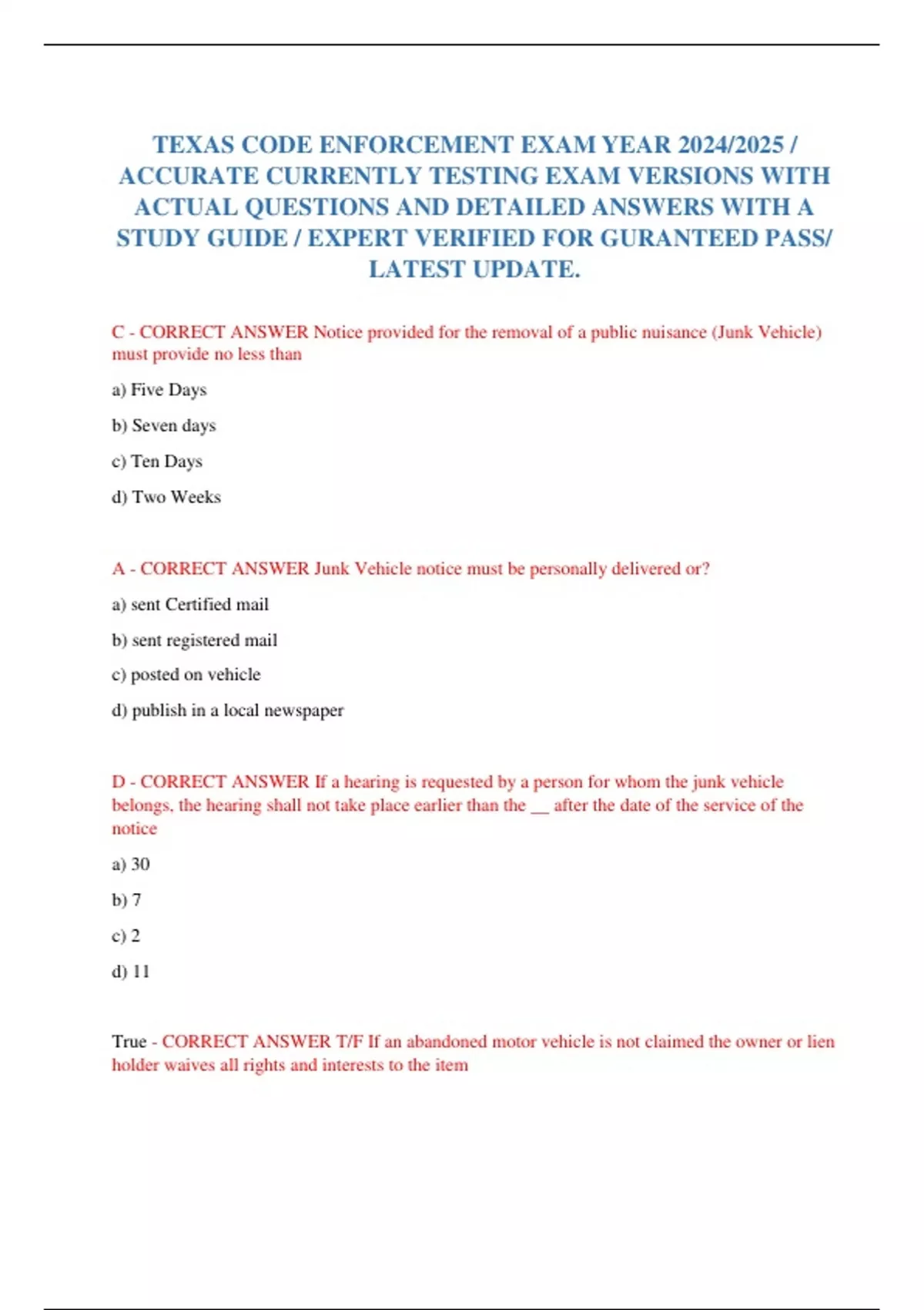C - CORRECT ANSWER Notice provided for the removal of a public nuisance (Junk Vehicle)