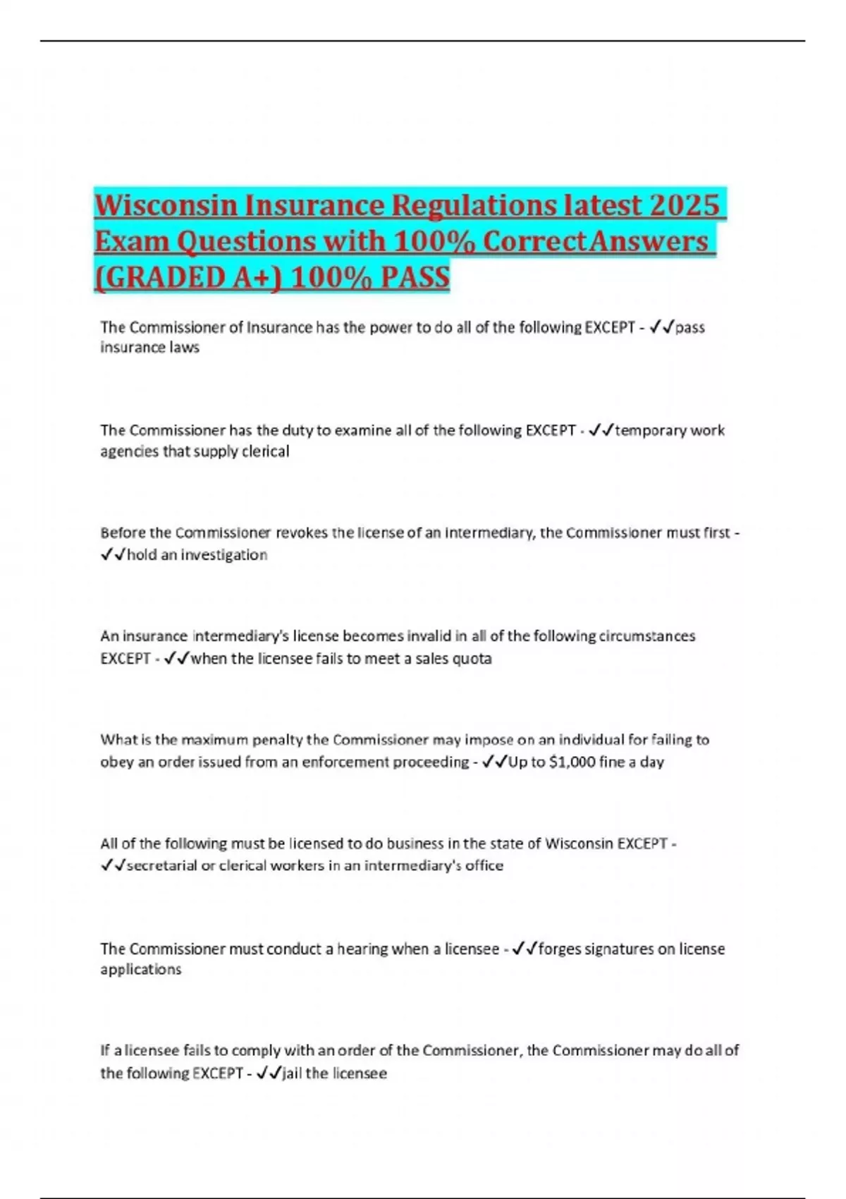 Wisconsin Insurance Regulations latest 2025 Exam Questions with 100% CorrectAnswers (GRADED A+) 100% PASS