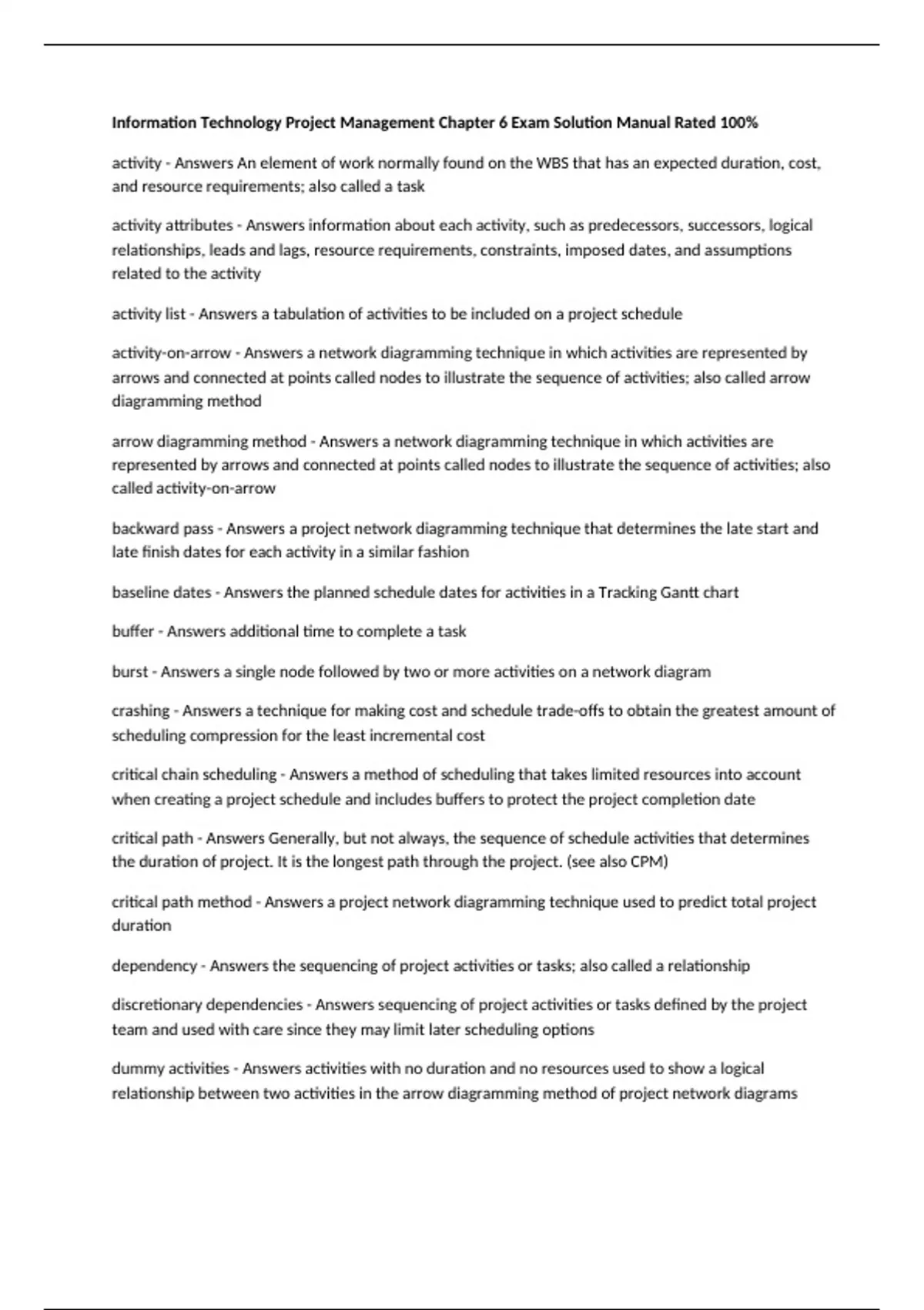 activity - Answers An element of work normally found on the WBS that has an expected duration, cost,
