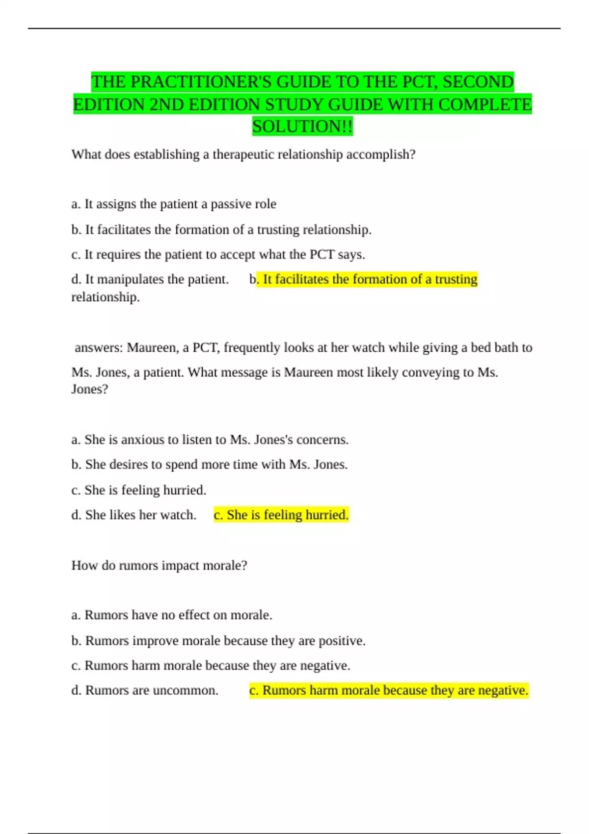 answers: Maureen, a PCT, frequently looks at her watch while giving a bed bath to