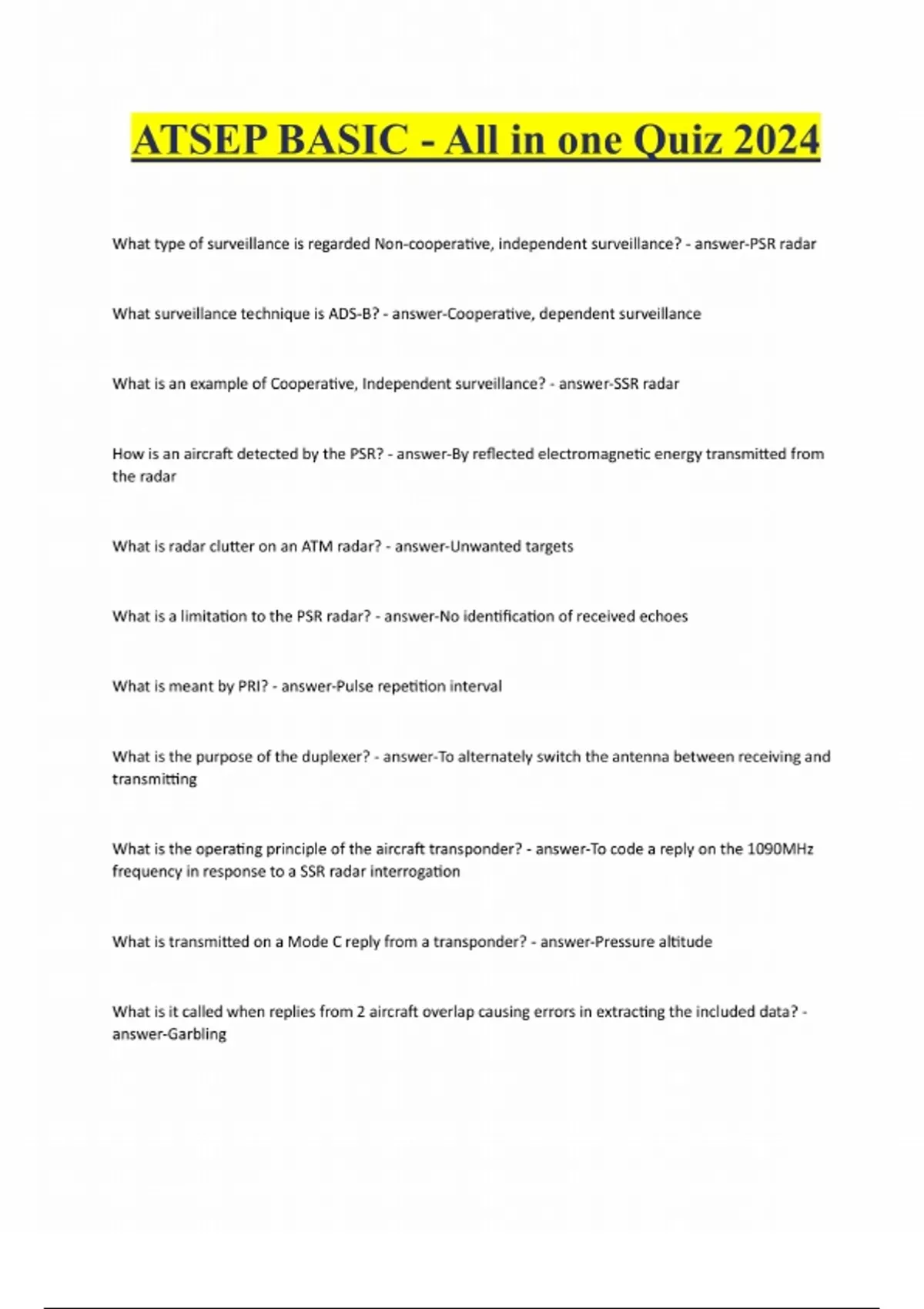 ATSEP BASIC - All in one Quiz 2024 What type of surveillance is regarded Non-cooperative, independent surveillance? - answer-PSR radar What surveillance technique is ADS-B? - answer-Cooperative, dependent surveillance What is an example of Cooperative, Independent surveillance? - answer-SSR radar How is an aircraft detected by the PSR? - answer-By reflected electromagnetic energy transmitted from the radar What is radar clutter on an ATM radar? - answer-Unwanted targets What is a limitation to the PSR radar? - answer-No identification of received echoes What is meant by PRI? - answer-Pulse repetition interval