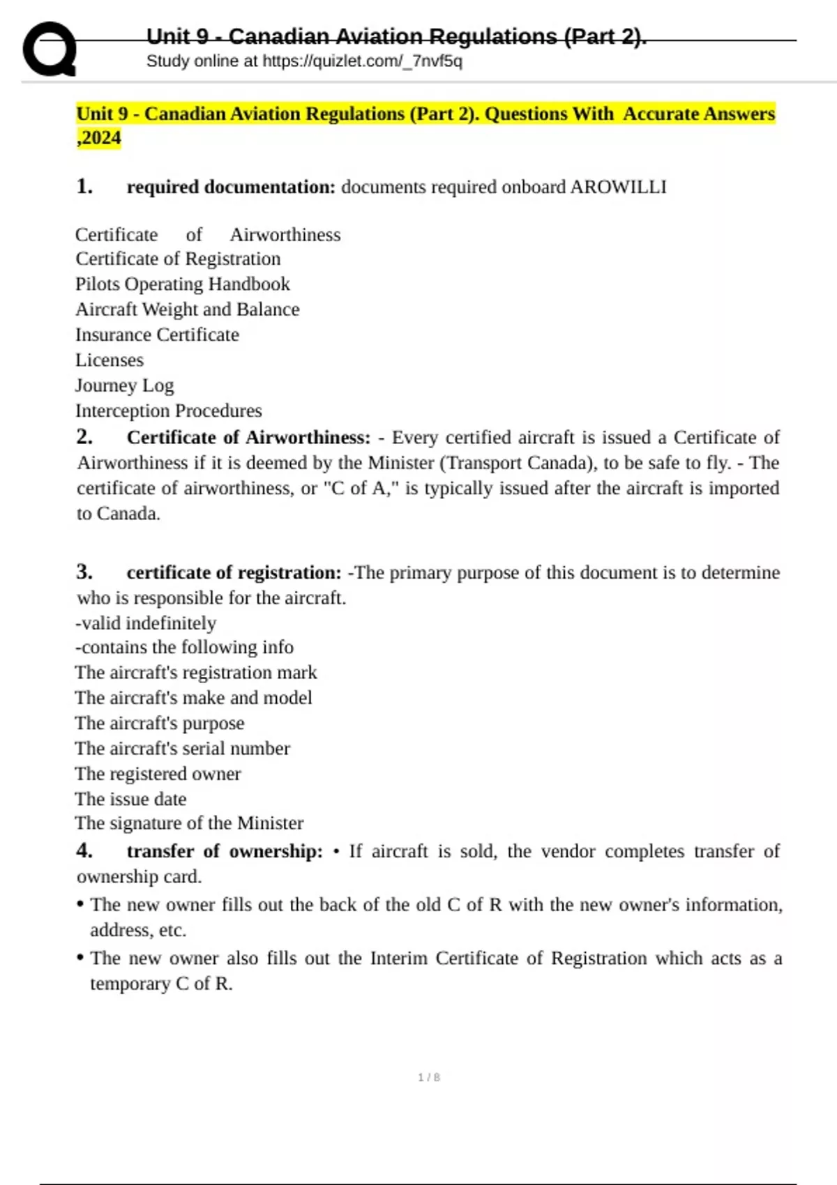 Unit 9 - Canadian Aviation Regulations (Part 2). Questions With Accurate Answers ,2024