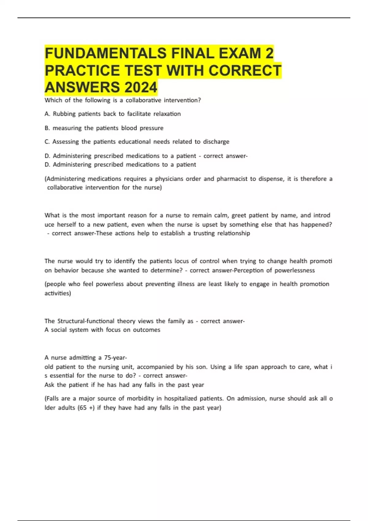 FUNDAMENTALS FINAL EXAM 2 PRACTICE TEST WITH CORRECT ANSWERS 2024.