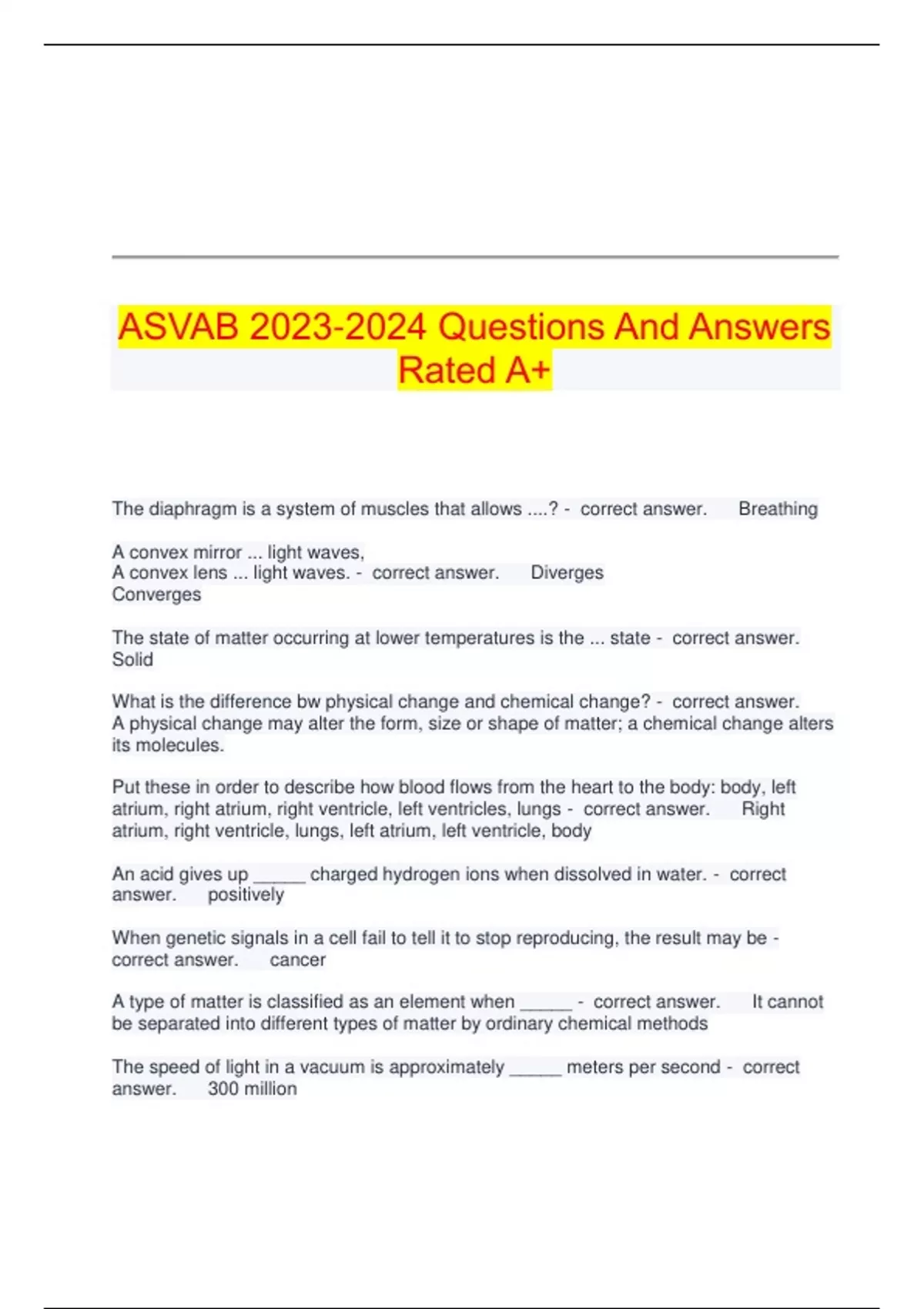 ASVAB Questions And Answers Rated A+ The diaphragm is a system of muscles that allows ....? - correct answer. Breathing A convex mirror ... light waves, A convex lens ... light waves. - correct answer. Diverges Converges The state of matter occurring at lower temperatures is the ... state - correct answer. Solid What is the difference bw physical change and chemical change? - correct answer. A physical change may alter the form, size or shape of matter; a chemical change alters its molecules. Put these in order to describe how blood flows from the heart to the body: body, left atrium, right atrium, right ventricle, left ventricles, lungs - correct answer. Right atrium, right ventricle, lungs, left atrium, left ventricle, body An acid gives up _____ charged hydrogen ions when dissolved in water. - correct answer. positively When genetic signals in a cell fail to tell it to stop reproducing, the result may be - correct answer. cancer A type of matter is classified as an element when _____ - correct answer. It cannot be separated into different types of matter by ordinary chemical methods The speed of light in a vacuum is approximately _____ meters per second - correct answer. 300 million What is inertia? - correct answer. The tendency of an object to resist a change in motion What is a vector quantity? - correct answer. a quantity defined by both magnitude and direction What formula is used to calculate velocity - correct answer. v = d/t, where v = velocity (a vector quantity), d = displacement (a vector quantity), and t = time Which two bodily functions are enhanced by calcium? - correct answer. bone growth, muscle function The Moon affects which activity on Earth? - correct answer. tides The asteroid belt closest to the Earth lies between which two planets? - correct answer. Mars and Jupiter Define biosphere - correct answer. The biosphere consists of the layers of Earth (crust, surface, atmosphere) where life naturally occurs. Why are the four planets closest to the sun called the terrestrial planets - correct answer. The composition of these planets is similar to that of Earth. A stationary front produces .. weather - correct answer. cloudy and wet The Earth is approximately _____ years old. - correct answer. 4.6 billion What are the five kingdoms of living things? - correct answer. Monera (sometimes split into Bacteria and Archaea), Protista, Fungi, Plantae, Animalia Put these classifications in order from broadest to narrowest: class, domain, family, genus, kingdom, species, order, phylum - correct answer. Domain, Kingdom, Phylum, Class, Order, Family, Genus, Species Define biome - correct answer. A biome is a major life zone of interrelated species bound together by a similar climate and similar plant and animal life. The genetic material of a eukaryotic cell is contained in its - correct answer. nucleus Diploids cells have .. times the number of chromosomes as do haploid cell - correct answer. Two How does vaccination (immunization) prevent disease - correct answer. it causes the immune system to react to a deactivated, weakened, or partial pathogen so that the immune system will react to future exposure to a similar pathogen What is a zygote? - correct answer. fertilized egg 1 kilometer is how many times larger than 1 millimeters - correct answer. 1,000,000 times larger Ova are carried from ovaries to the uterus through the _________. - correct answer. fallopian tubes The .. is the major connecting center between the brain and the nerve network - correct answer. spinal cord What is another name for large intestines - correct answer. colon A magnetic compass' .. pole points to the Earth's North Pole - correct answer. South What does a positive or negative sign in a blood type indicate - correct answer. Rh factor The aorta is the largest .. in the body - correct answer. artery The respiratory system enables blood cells to absorb.. and eliminate.. and water vapor - correct answer. oxygen and carbon dioxide Bananas are a source of which important mineral? - correct answer. Potassium What is a unique feature of vitamin D - correct answer. One of its best sources comes not from diet but from the Sun. The skin generates vitamin D in response to ultraviolet rays. In chms rxn, the molecule and atoms entering the rxn are called .., and those resulting from the rxn are called.. - correct answer. Reactants; products Which particle of an atom carries a positive charge? No charge? - correct answer. Proton, electron, neutron The .. nervous system controls voluntary actions, and the.. nervous system control involuntary activity - correct answer. Somatic ; autonomic Earth's core is nearly twice as dense as its marble because the core is... - correct answer. Metallic Define molecule - correct answer. A molecule is the smallest particle of a substance that has the properties of that substance. A molecule is composed of two or more atoms.