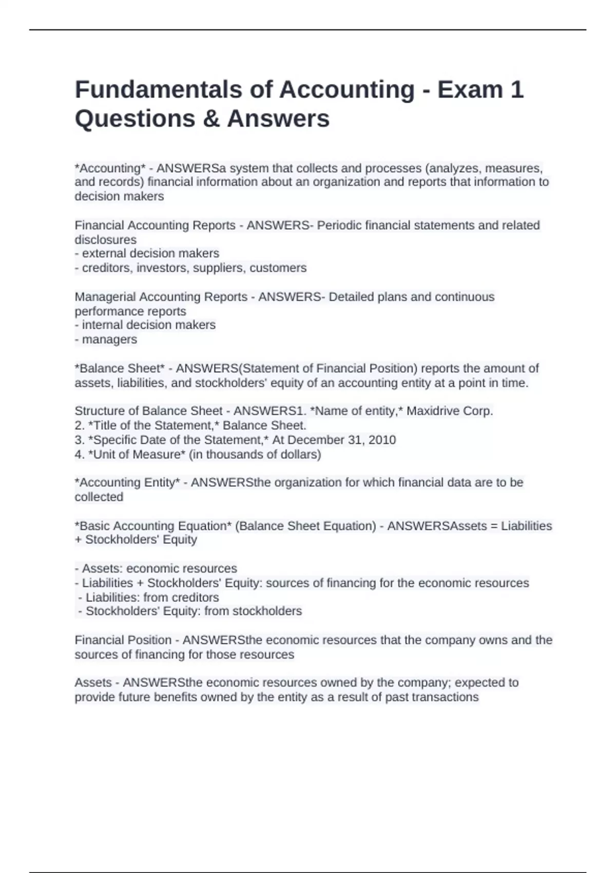 *Basic Accounting Equation* (Balance Sheet Equation) - ANSWERSAssets = Liabilities