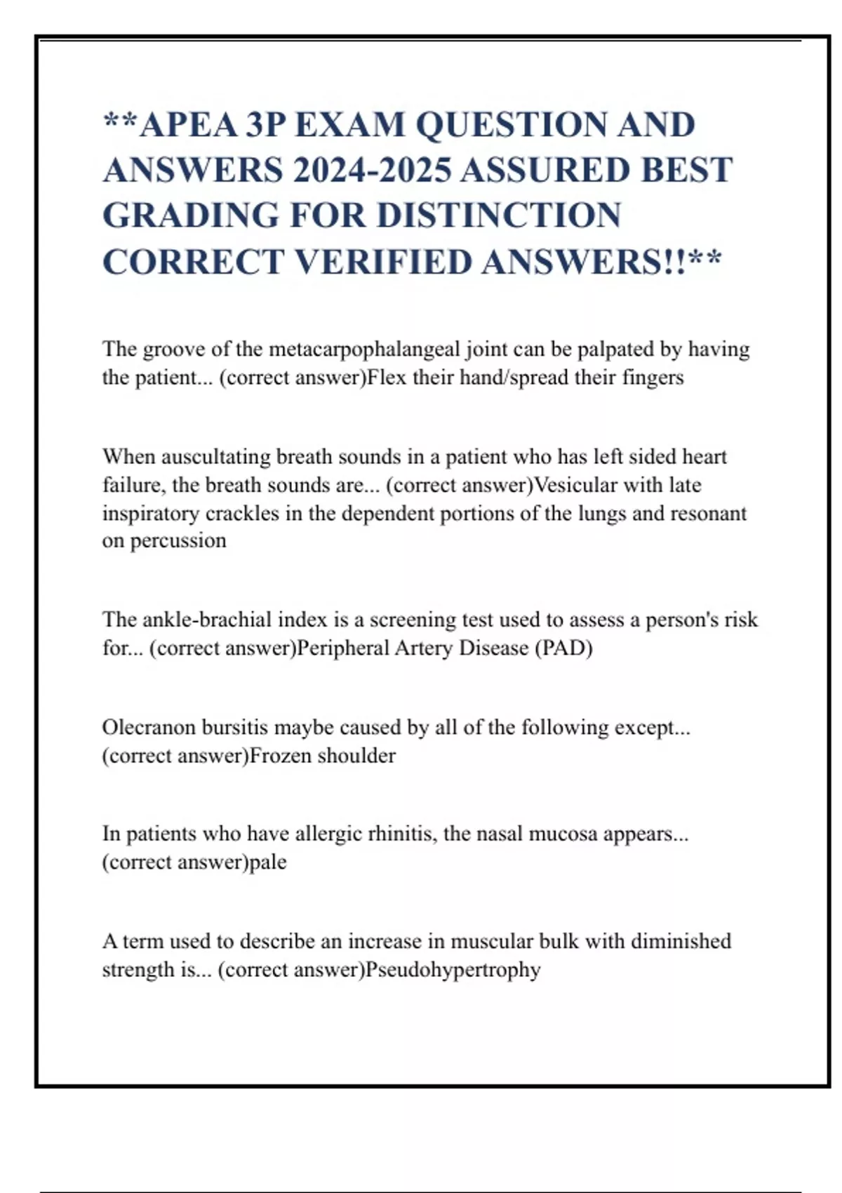 **APEA 3P EXAM QUESTION AND ANSWERS ASSURED BEST GRADING FOR DISTINCTION CORRECT VERIFIED ANSWERS!!**