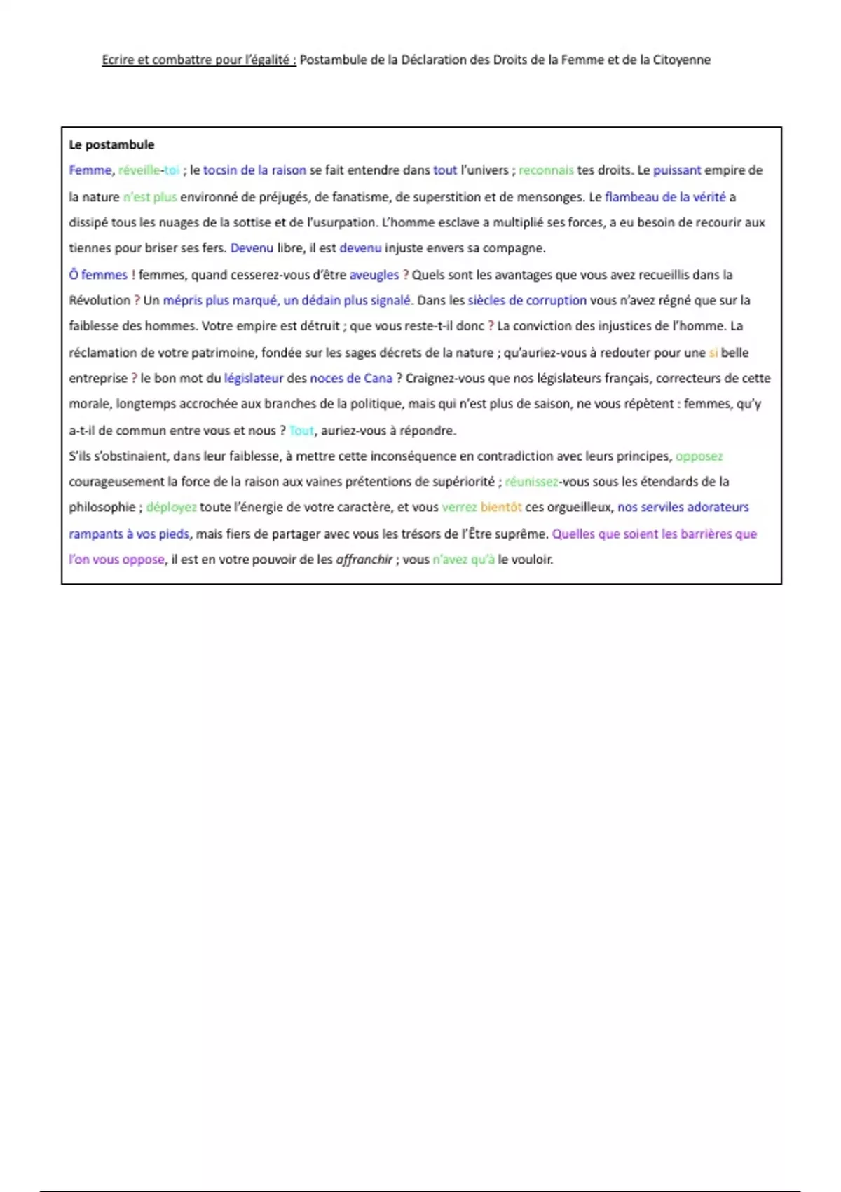 passage est le début de ce postambule où De Gouges cherche à mobiliser voire à exalter les femmes afin