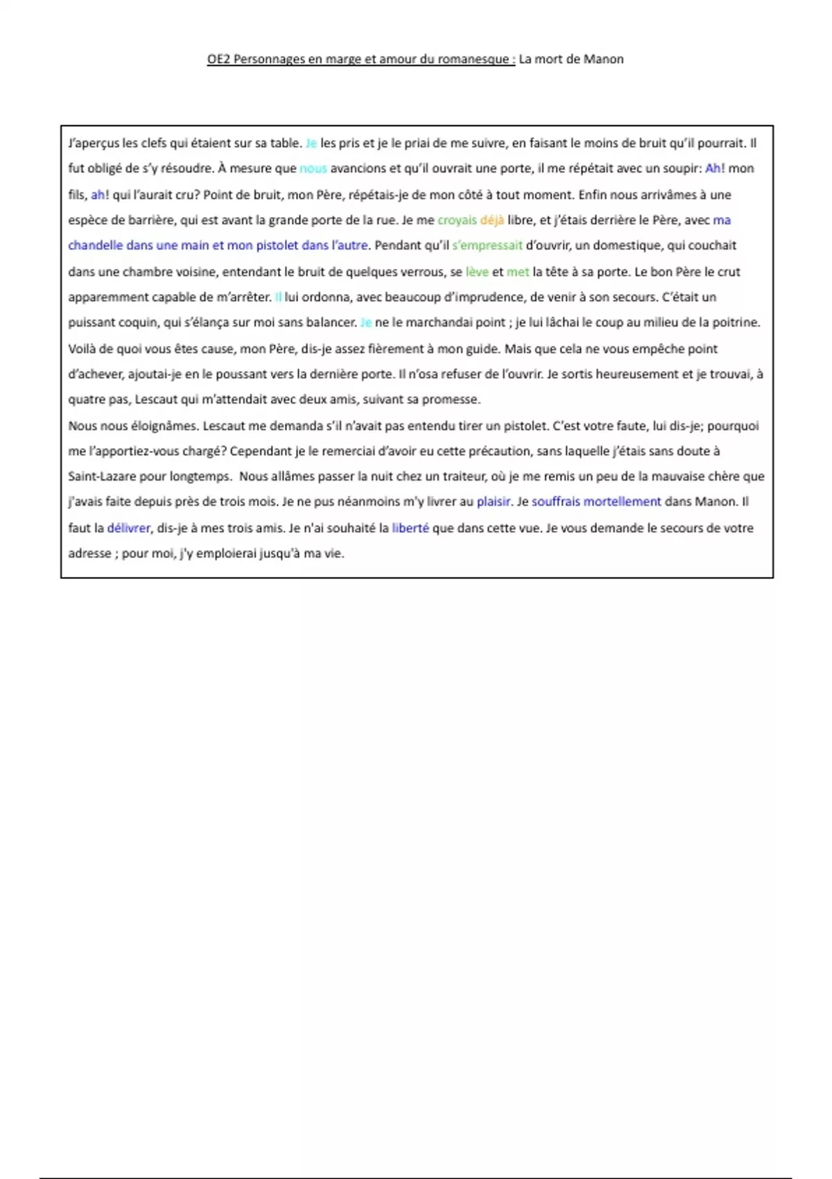 , OE2 Personnages en marge et amour du romanesque : La mort de Manon