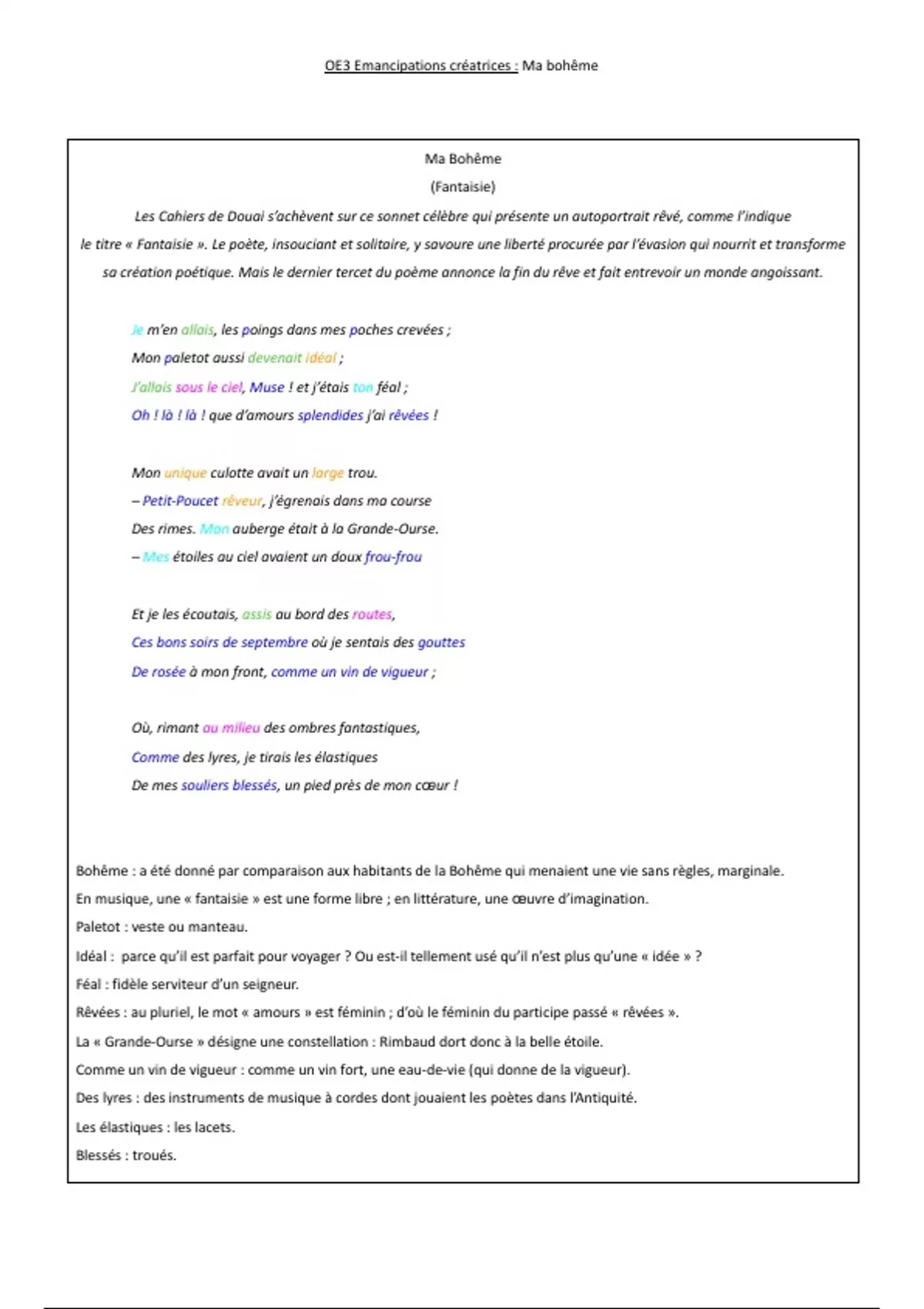 Le poème “Ma Bohème” est le dernier des Cahiers de Douai. Le poète évoque la vie de bohème qu’il a