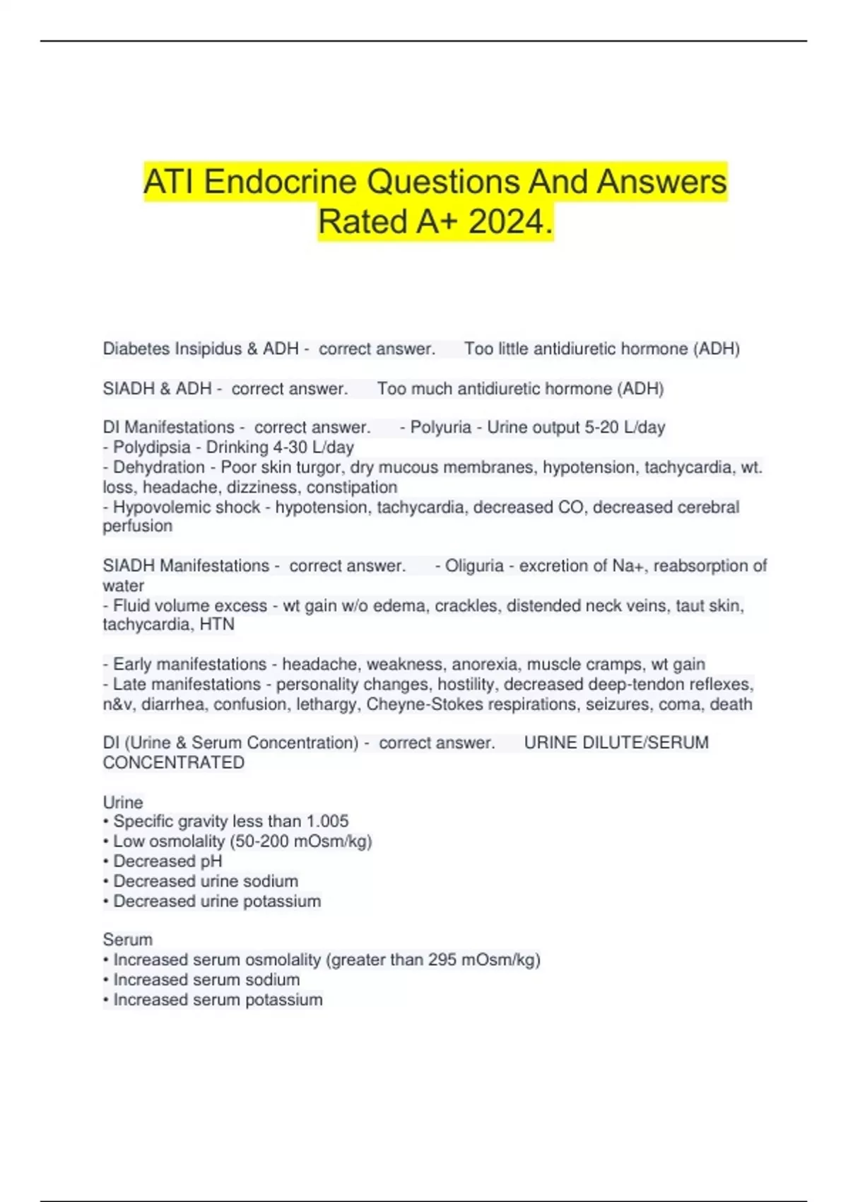 ATI Endocrine Questions And Answers Rated A+ 2024. Diabetes Insipidus & ADH - correct answer. Too little antidiuretic hormone (ADH) SIADH & ADH - correct answer. Too much antidiuretic hormone (ADH) DI Manifestations - correct answer. - Polyuria - Urine output 5-20 L/day - Polydipsia - Drinking 4-30 L/day - Dehydration - Poor skin turgor, dry mucous membranes, hypotension, tachycardia, wt. loss, headache, dizziness, constipation - Hypovolemic shock - hypotension, tachycardia, decreased CO, decreased cerebral perfusion SIADH Manifestations - correct answer. - Oliguria - excretion of Na+, reabsorption of water - Fluid volume excess - wt gain w/o edema, crackles, distended neck veins, taut skin, tachycardia, HTN - Early manifestations - headache, weakness, anorexia, muscle cramps, wt gain - Late manifestations - personality changes, hostility, decreased deep-tendon reflexes, n&v, diarrhea, confusion, lethargy, Cheyne-Stokes respirations, seizures, coma, death DI (Urine & Serum Concentration) - correct answer. URINE DILUTE/SERUM CONCENTRATED Urine • Specific gravity less than 1.005 • Low osmolality (50-200 mOsm/kg) • Decreased pH • Decreased urine sodium • Decreased urine potassium Serum • Increased serum osmolality (greater than 295 mOsm/kg) • Increased serum sodium • Increased serum potassium • Serum Na+ & K+ are high only because serum is concentrated SIADH (Urine & Serum Concentration) - correct answer. URINE CONCENTRATED/SERUM DILUTE Urine • Specific gravity greater than 1.025 • High osmolality (greater than 295 mOsm/kg) • Increased urine sodium • Increased urine potassium Serum • Decreased serum osmolality (less than 270 mOsm/kg) • Decreased serum sodium • Decreased serum potassium Most definitive test for Addison's disease - correct answer. ACTH stimulation test PTU is given to suppress the thyroid hormone. Tx goals have been met when client reports... - correct answer. An increase in weight (Note: Will also cause decrease in sweat, stool, and appetite) Before intranasal adm of desmopressin acetate (DDAVP), the nurse should instruct the client to do this - correct answer. Prior to adm of this med, blow nose gently Side effects of long term corticosteroid therapy include... - correct answer. Osteoporosis (depletion of calcium), development of moon-shaped face (due to distribution of fat in face, upper back, trunk), increased risk of infection, and muscle wasting of extremities (depletion of nitrogen) 2 to 3 days prior to vanillylmandelic acid test, this should be avoided. - correct answer. Caffeine should be avoided To promote proper absorption, how should thyroid hormone replacement therapy be taken? - correct answer. On an empty stomach Increased hematocrit level is an expected finding related to... - correct answer. Dehydration Hyperglycemic-hyperosmolar nonketotic syndrome expected findings - correct answer. - Blood glucose >600 mg/dl - pH within expected range For a client with pheochromocytoma, avoid palpation of... - correct answer. Abdomen (Note: could cause sudden release of catecholamines from adrenal gland precipitating hypertensive crisis) Diabetes Insipidus & ADH - correct answer. Too little antidiuretic hormone (ADH) SIADH & ADH - correct answer. Too much antidiuretic hormone (ADH) DI Manifestations - correct answer. - Polyuria - Urine output 5-20 L/day - Polydipsia - Drinking 4-30 L/day - Dehydration - Poor skin turgor, dry mucous membranes, hypotension, tachycardia, wt. loss, headache, dizziness, constipation - Hypovolemic shock - hypotension, tachycardia, decreased CO, decreased cerebral perfusion SIADH Manifestations - correct answer. - Oliguria - excretion of Na+, reabsorption of water - Fluid volume excess - wt gain w/o edema, crackles, distended neck veins, taut skin, tachycardia, HTN - Early manifestations - headache, weakness, anorexia, muscle cramps, wt gain - Late manifestations - personality changes, hostility, decreased deep-tendon reflexes, n&v, diarrhea, confusion, lethargy, Cheyne-Stokes respirations, seizures, coma, death DI (Urine & Serum Concentration) - correct answer. URINE DILUTE/SERUM CONCENTRATED Urine • Specific gravity less than 1.005 • Low osmolality (50-200 mOsm/kg) • Decreased pH • Decreased urine sodium • Decreased urine potassium Serum • Increased serum osmolality (greater than 295 mOsm/kg) • Increased serum sodium • Increased serum potassium • Serum Na+ & K+ are high only because serum is concentrated SIADH (Urine & Serum Concentration) - correct answer. URINE CONCENTRATED/SERUM DILUTE Urine • Specific gravity greater than 1.025 • High osmolality (greater than 295 mOsm/kg)