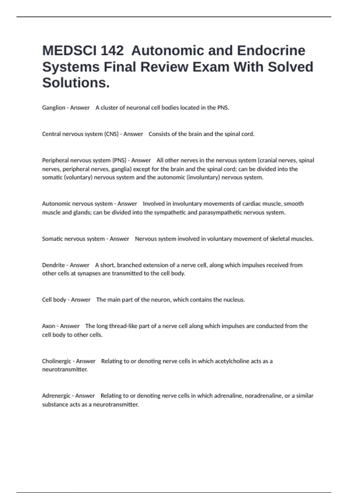 MEDSCI 142 Autonomic and Endocrine Systems Final Review Exam With Solved Solutions.