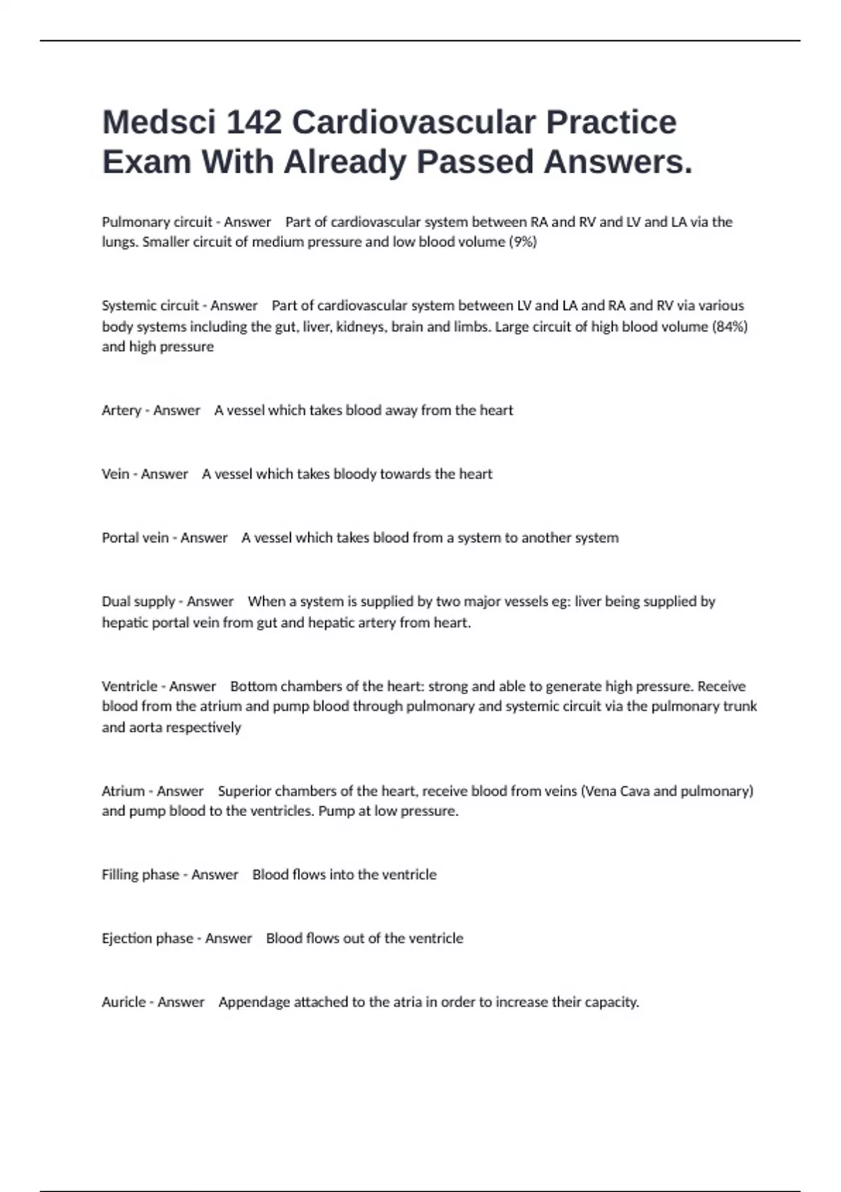 Pulmonary circuit - Answer Part of cardiovascular system between RA and RV and LV and LA via the lungs. Smaller circuit of medium pressure and low blood volume (9%) Systemic circuit - Answer Part of cardiovascular system between LV and LA and RA and RV via various body systems including the gut, liver, kidneys, brain and limbs. Large circuit of high blood volume (84%) and high pressure Artery - Answer A vessel which takes blood away from the heart Vein - Answer A vessel which takes bloody towards the heart Portal vein - Answer A vessel which takes blood from a system to another system Dual supply - Answer When a system is supplied by two major vessels eg: liver being supplied by hepatic portal vein from gut and hepatic artery from heart. Ventricle - Answer Bottom chambers of the heart: strong and able to generate high pressure. Receive blood from the atrium and pump blood through pulmonary and systemic circuit via the pulmonary trunk and aorta respectively Atrium - Answer Superior chambers of the heart, receive blood from veins (Vena Cava and pulmonary) and pump blood to the ventricles. Pump at low pressure. Filling phase - Answer Blood flows into the ventricle Ejection phase - Answer Blood flows out of the ventricle Auricle - Answer Appendage attached to the atria in order to increase their capacity.