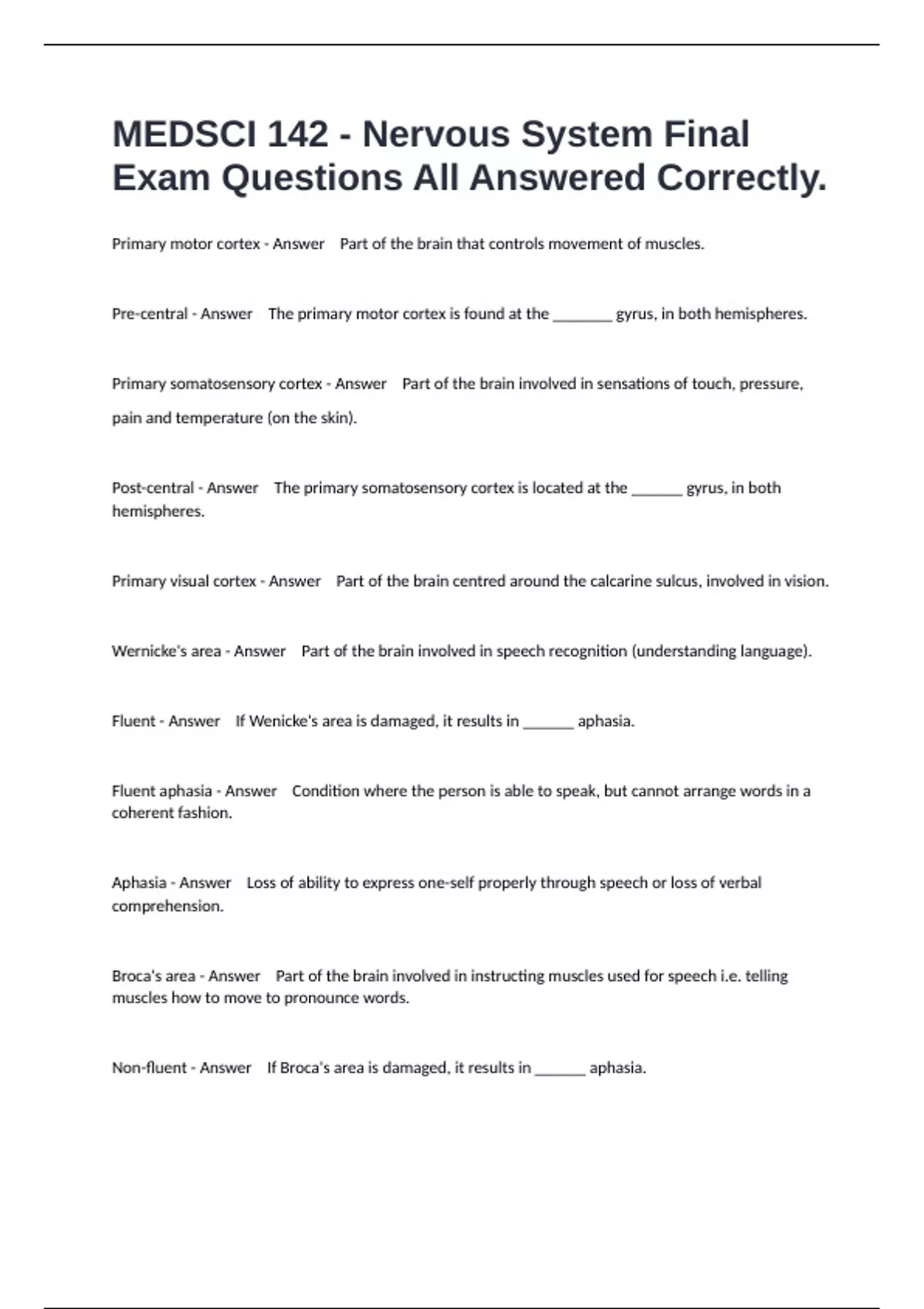 Primary motor cortex - Answer Part of the brain that controls movement of muscles. Pre-central - Answer The primary motor cortex is found at the _______ gyrus, in both hemispheres. Primary somatosensory cortex - Answer Part of the brain involved in sensations of touch, pressure, pain and temperature (on the skin). Post-central - Answer The primary somatosensory cortex is located at the ______ gyrus, in both hemispheres. Primary visual cortex - Answer Part of the brain centred around the calcarine sulcus, involved in vision. Wernicke's area - Answer Part of the brain involved in speech recognition (understanding language). Fluent - Answer If Wenicke's area is damaged, it results in ______ aphasia. Fluent aphasia - Answer Condition where the person is able to speak, but cannot arrange words in a coherent fashion. Aphasia - Answer Loss of ability to express one-self properly through speech or loss of verbal comprehension. Broca's area - Answer Part of the brain involved in instructing muscles used for speech i.e. telling muscles how to move to pronounce words. Non-fluent - Answer If Broca's area is damaged, it results in ______ aphasia.