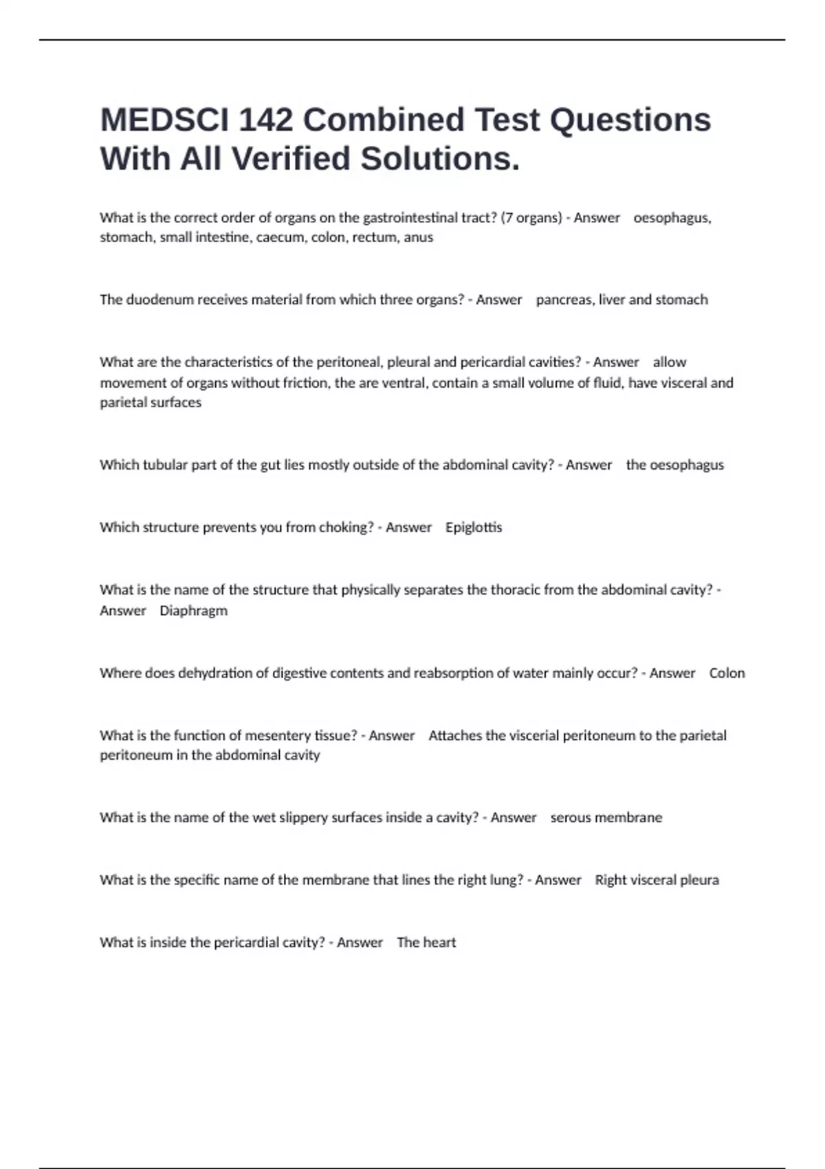 What is the correct order of organs on the gastrointestinal tract? (7 organs) - Answer oesophagus, stomach, small intestine, caecum, colon, rectum, anus The duodenum receives material from which three organs? - Answer pancreas, liver and stomach What are the characteristics of the peritoneal, pleural and pericardial cavities? - Answer allow movement of organs without friction, the are ventral, contain a small volume of fluid, have visceral and parietal surfaces Which tubular part of the gut lies mostly outside of the abdominal cavity? - Answer the oesophagus Which structure prevents you from choking? - Answer Epiglottis What is the name of the structure that physically separates the thoracic from the abdominal cavity? - Answer Diaphragm Where does dehydration of digestive contents and reabsorption of water mainly occur? - Answer Colon What is the function of mesentery tissue? - Answer Attaches the viscerial peritoneum to the parietal peritoneum in the abdominal cavity What is the name of the wet slippery surfaces inside a cavity? - Answer serous membrane What is the specific name of the membrane that lines the right lung? - Answer Right visceral pleura What is inside the pericardial cavity? - Answer The heart