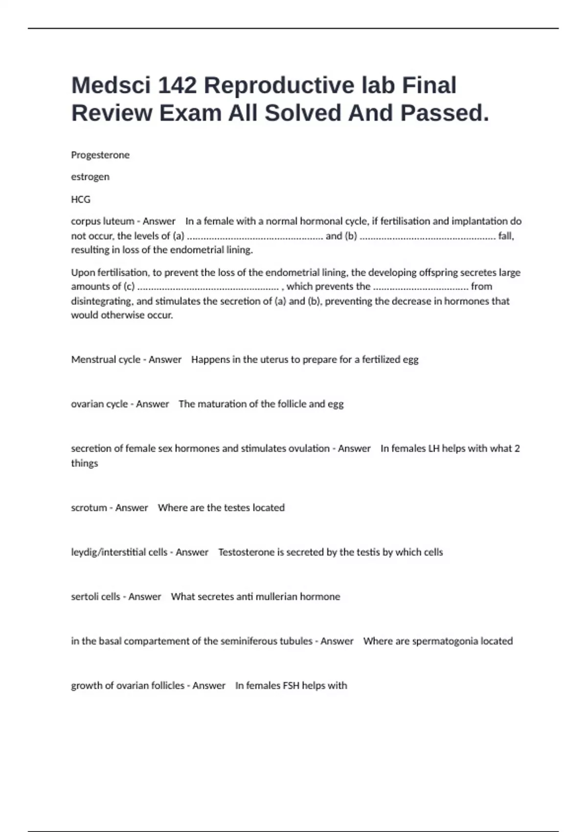 Medsci 142 Reproductive lab Final Review Exam All Solved And Passed.