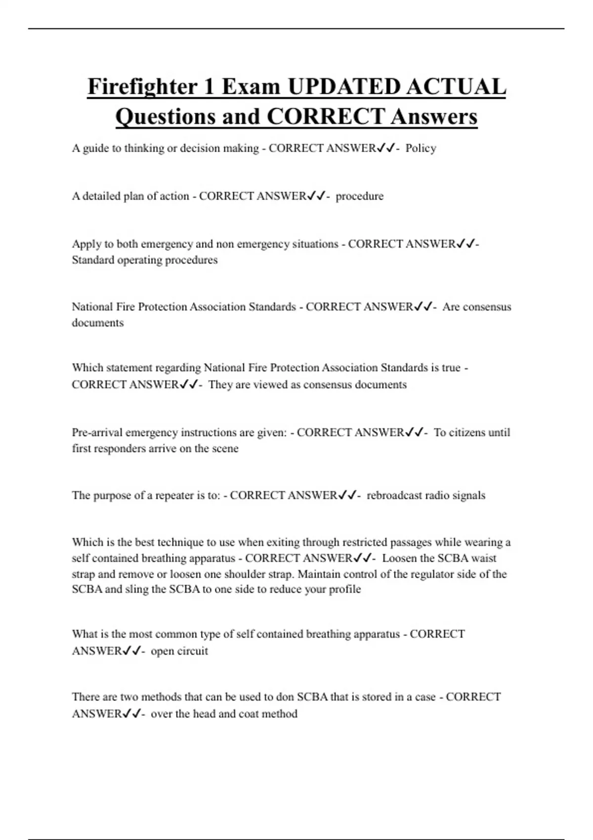 Firefighter 1 Exam UPDATED ACTUAL Questions and CORRECT Answers A guide to thinking or decision making - CORRECT ANSWER- Policy A detailed plan of action - CORRECT ANSWER- procedure Apply to both emergency and non emergency situations - CORRECT ANSWER- Standard operating procedures