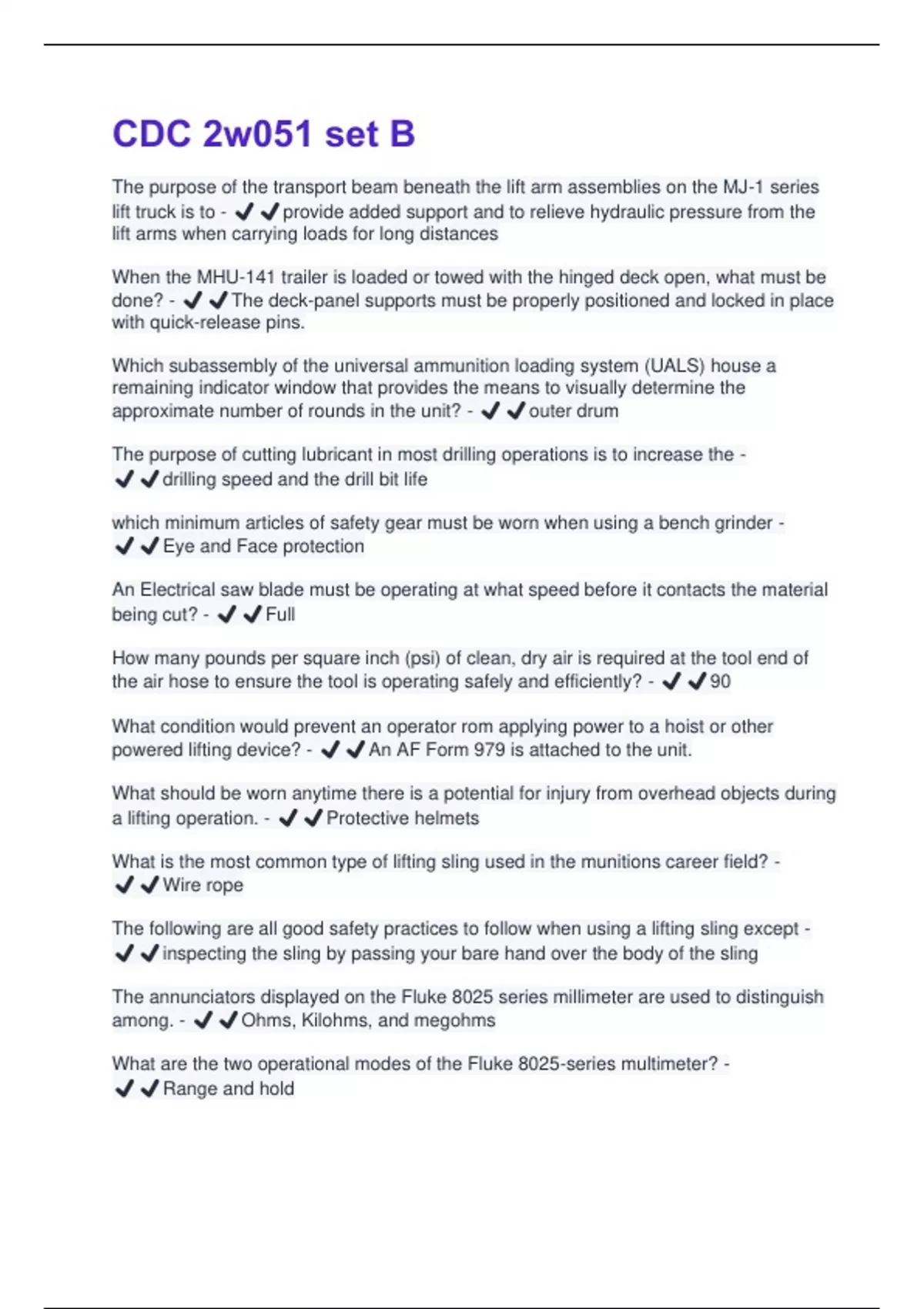 The purpose of the transport beam beneath the lift arm assemblies on the MJ-1 series lift truck is to - ️️provide added support and to relieve hydraulic pressure from the lift arms when carrying loads for long distances When the MHU-141 trailer is loaded or towed with the hinged deck open, what must be done? - ️️The deck-panel supports must be properly positioned and locked in place with quick-release pins. Which subassembly of the universal ammunition loading system (UALS) house a remaining indicator window that provides the means to visually determine the approximate number of rounds in the unit? - ️️outer drum The purpose of cutting lubricant in most drilling operations is to increase the - ️️drilling speed and the drill bit life which minimum articles of safety gear must be worn when using a bench grinder - ️️Eye and Face protection An Electrical saw blade must be operating at what speed before it contacts the material being cut? - ️️Full How many pounds per square inch (psi) of clean, dry air is required at the tool end of the air hose to ensure the tool is operating safely and efficiently? - ️️90