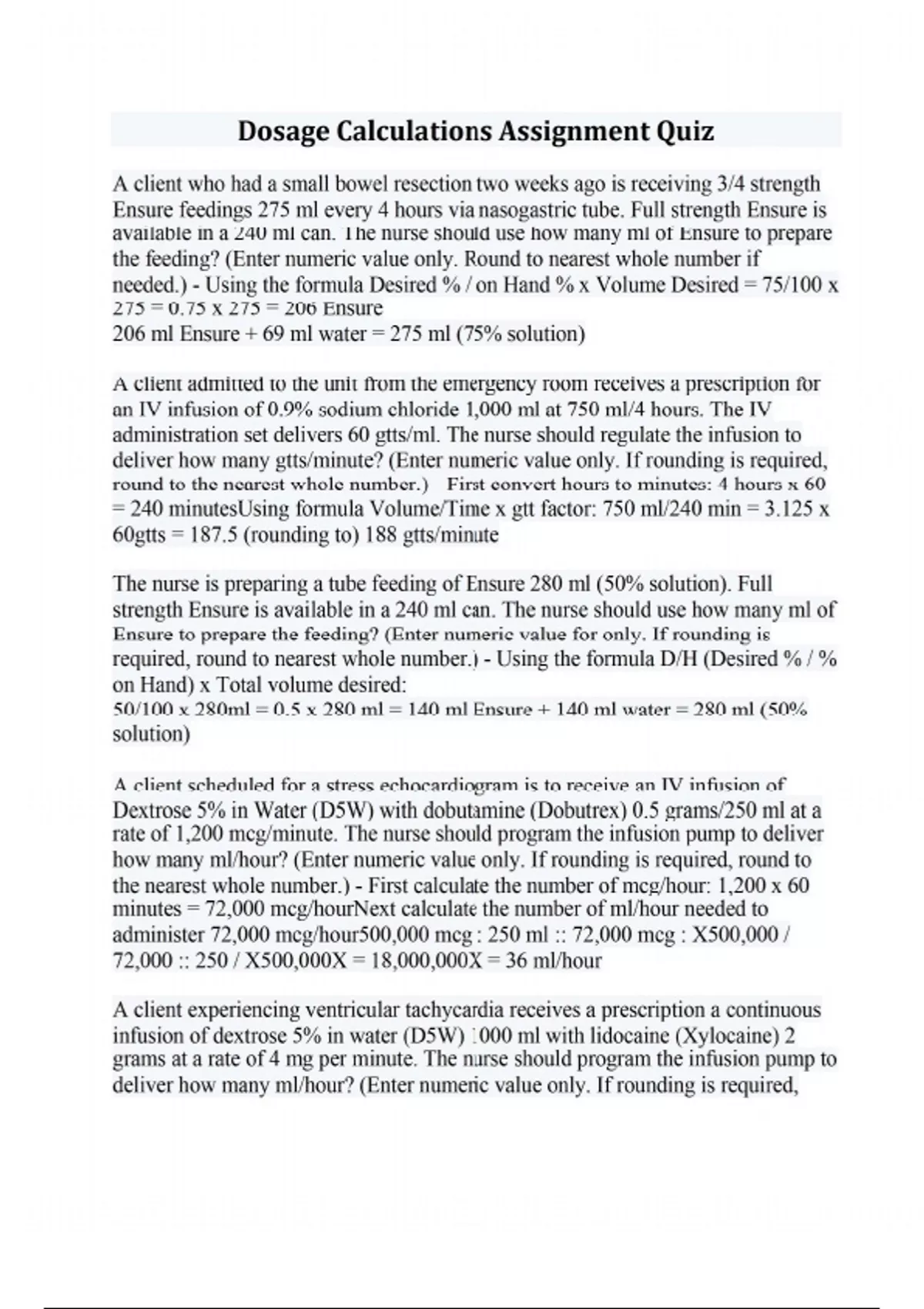 A client who had a small bowel resection two weeks ago is receiving 3/4 strength Ensure feedings 275 ml every 4 hours via nasogastric tube. Full strength Ensure is available in a 240 ml can. The nurse should use how many ml of Ensure to prepare the feeding? (Enter numeric value only. Round to nearest whole number if needed.) - Using the formula Desired % / on Hand % x Volume Desired = 75/100 x 275 = 0.75 x 275 = 206 Ensure 206 ml Ensure + 69 ml water = 275 ml (75% solution) A client admitted to the unit from the emergency room receives a prescription for an IV infusion of 0.9% sodium chloride 1,000 ml at 750 ml/4 hours. The IV administration set delivers 60 gtts/ml. The nurse should regulate the infusion to deliver how many gtts/minute? (Enter numeric value only. If rounding is required, round to the nearest whole number.) - First convert hours to minutes: 4 hours x 60 = 240 minutesUsing formula Volume/Time x gtt factor: 750 ml/240 min = 3.125 x 60gtts = 187.5 (rounding to) 188 gtts/minute The nurse is preparing a tube feeding of Ensure 280 ml (50% solution). Full strength Ensure is available in a 240 ml can. The nurse should use how many ml of Ensure to prepare the feeding? (Enter numeric value for only. If rounding is required, round to nearest whole number.) - Using the formula D/H (Desired % / % on Hand) x Total volume desired: 50/100 x 280ml = 0.5 x 280 ml = 140 ml Ensure + 140 ml water = 280 ml (50% solution) A client scheduled for a stress echocardiogram is to receive an IV infusion of Dextrose 5% in Water (D5W) with dobutamine (Dobutrex) 0.5 grams/250 ml at a rate of 1,200 mcg/minute. The nurse should program the infusion pump to deliver how many ml/hour? (Enter numeric value only. If rounding is required, round to the nearest whole number.) - First calculate the number of mcg/hour: 1,200 x 60 minutes = 72,000 mcg/hourNext calculate the number of ml/hour needed to administer 72,000 mcg/hour500,000 mcg : 250 ml :: 72,000 mcg : X500,000 / 72,000 :: 250 / X500,000X = 18,000,000X = 36 ml/hour A client experiencing ventricular tachycardia receives a prescription a continuous infusion of dextrose 5% in water (D5W) 1000 ml with lidocaine (Xylocaine) 2 grams at a rate of 4 mg per minute. The nurse should program the infusion pump to deliver how many ml/hour? (Enter numeric value only. If rounding is required, round to the nearest whole number.) - First convert solution gram/ml to milligrams/ml: 2 gm/1000 ml = 2000 mg/1000 ml = 2 mg/mlNext calculate the number of mg/hour for the dose: 4 mg X 60 minutes = 240 mg/hourNext calculate the number of ml/hour needed to administer 240 mg/hour: 2000 mg: 1000 ml :: 240 mg : X ml2000/240 = 1000/XX = 120 ml/hour The healthcare provider prescribes an intermittent infusion of nafcillin (Unipen) 800 mg IV for a pediatric client. The drug is dispensed in a concentration of 250 mg/ml, and the recommended infusion concentration is 40 mg/ml. When adding the prescribed dose to the volume control device, how many ml of IV solution should the nurse add to dilute? (Enter numeric value only. If rounding is required, round to the nearest tenth.) - First, calculate the amount of milliliters of medication needed to provide 800 mg of nafcillin. Prescribed dose (800 mg) divided by dose on hand (250 mg/ml) equals 3.2 mlNext, determine the recommended concentration using equivalent fractions. 800 mg/X = 40 mg/1 ml40X = 800 = 20 ml (the total volume at the recommended concentration)20 ml (total volume) minus the 3.2 ml (800 mg dose) equals an additional 16.8 ml of fluid to be added to the volume control device to obtain the recommended concentration. The nurse programs an IV infusion pump of Ringer's Lactated 1,000 ml with oxytocin (Pitocin) 40 units to be delivered at 15 ml/hour. How many milliunits/minute is the client receiving? (Enter numeric value only, whole number.) - Convert units to milliunits, 40 x 1,000 = 40,000 milliunits. Using D/H x Q = 15 ml/hour: X/40,000 milliunits x 1,000 ml = 15 ml/hour (60 minutes) X/40 =15/60 60X = 600 X = 10 Fill in the blank The healthcare provider prescribes phytonadione (AquaMEPHYTON) 250 mcg IM to be administered to an infant within 1 hour of admission to the nursery. A 0.5 ml ampule labeled 2 mg in 1 ml is available. The nurse should administer how many ml? (Enter numeric value only. If rounding is required, round to the nearest hundredth.) - Change mcg to mg, 1000 mcg = 1 mgUse ratio and proportion to calculate the dose: 2 mg : 1 ml :: 0.25 mg : X ml2X = 0.25 mgX = 0.125 =0.13 ml