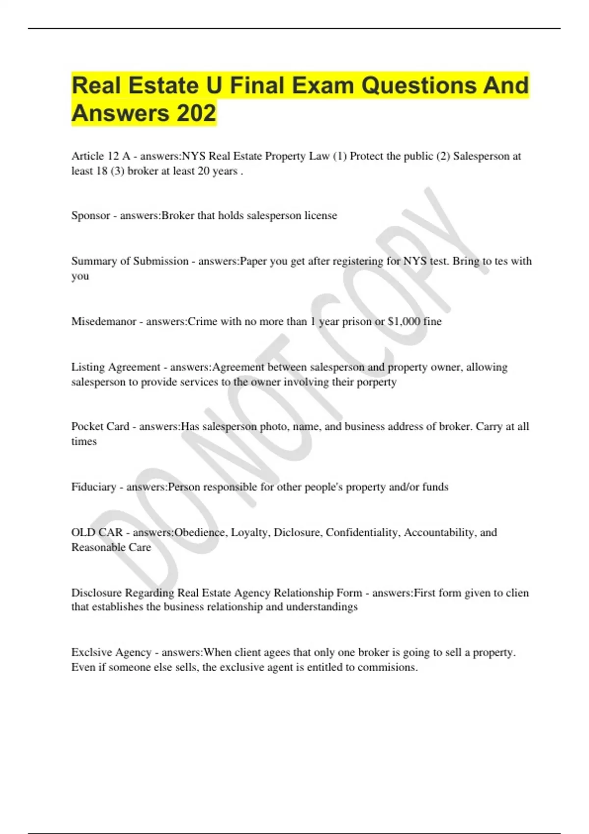 Real Estate U Final Exam Questions And Answers 2024