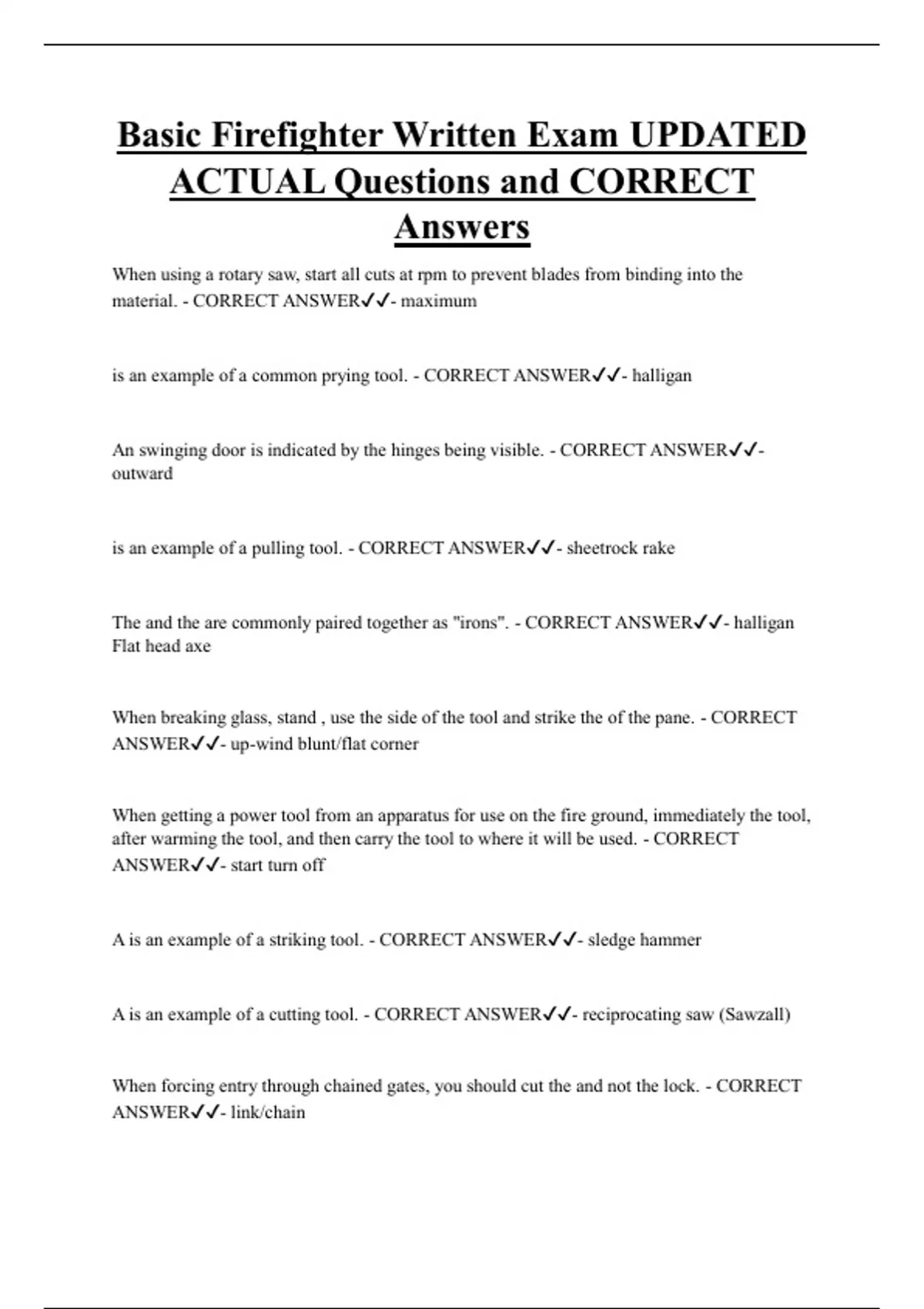 Basic Firefighter Written Exam UPDATED ACTUAL Questions and CORRECT Answers When using a rotary saw, start all cuts at rpm to prevent blades from binding into the material. - CORRECT ANSWER- maximum is an example of a common prying tool. - CORRECT ANSWER- halligan An swinging door is indicated by the hinges being visible. - CORRECT ANSWER- outward