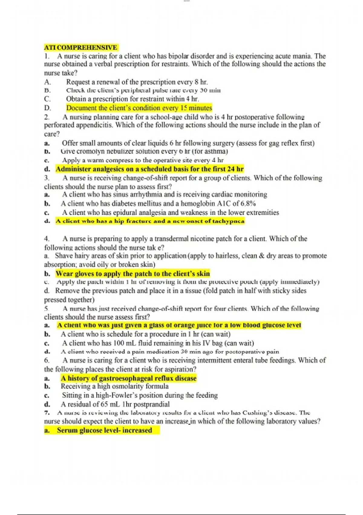 ATI COMPREHENSIVE 1. A nurse is caring for a client who has bipolar disorder and is experiencing acute mania. The nurse obtained a verbal prescription for restraints. Which of the following should the actions the nurse take? A. Request a renewal of the prescription every 8 hr. B. Check the client’s peripheral pulse rate every 30 min C. Obtain a prescription for restraint within 4 hr. D. Document the client’s condition every 15 minutes 2. A nursing planning care for a school-age child who is 4 hr postoperative following perforated appendicitis. Which of the following actions should the nurse include in the plan of care? a. Offer small amounts of clear liquids 6 hr following surgery (assess for gag reflex first) b. Give cromolyn nebulizer solution every 6 hr (for asthma) c. Apply a warm compress to the operative site every 4 hr d. Administer analgesics on a scheduled basis for the first 24 hr 3. A nurse is receiving change-of-shift report for a group of clients. Which of the following clients should the nurse plan to assess first? a. A client who has sinus arrhythmia and is receiving cardiac monitoring b. A client who has diabetes mellitus and a hemoglobin A1C of 6.8% c. A client who has epidural analgesia and weakness in the lower extremities d. A client who has a hip fracture and a new onset of tachypnea 4. A nurse is preparing to apply a transdermal nicotine patch for a client. Which of the following actions should the nurse tak e? a. Shave hairy areas of skin prior to application (apply to hairless, clean & dry areas to promote absorption; avoid oily or broken skin) b. Wear gloves to apply the patch to the client’s skin c. Apply the patch within 1 hr of removing it from the protective pouch (apply immediately) d. Remove the previous patch and place it in a tissue (fold patch in half with sticky sides pressed together) 5. A nurse has just received change-of-shift report for four clients. Which of the following clients should the nurse assess first? a. A client who was just given a glass of orange juice for a low blood glucose level b. A client who is schedule for a procedure in 1 hr (can wait) c. A client who has 100 mL fluid remaining in his IV bag (can wait) d. A client who received a pain medication 30 min ago for postoperative pain 6. A nurse is caring for a client who is receiving intermittent enteral tube feedings. Which of the following places the client at risk for aspiration? a. A history of gastroesophageal reflux disease b. Receiving a high osmolarity formula c. Sitting in a high-Fowler’s position during the feeding d. A residual of 65 mL 1hr postprandial 7. A nurse is reviewing the laboratory results for a client who has Cushing’s disease. The nurse should expect the client to have an increase in which of the following laboratory values? a. Serum glucose level- increased lOMoAR cPSD | b. Serum calcium level-decreased c. Lymphocyte count- decreased immune system. d. Serum potassium level- decreased . 8. A nurse is caring for a client who has severe preeclampsia and is receiving magnesium sulfate intravenously. The nurse discontinues the magnesium sulfate after the client displaces toxicity. Which of the following actions should the nurse take? a. Position the client supine b. Prepare an IV bolus of dextrose 5% in water c. Administer methylergonovine IM d. Administer calcium gluconate IV Calcium gluconate is given for magnesium sulfate toxicity. Always have an injectable form of calcium gluconate available when administering magnesium sulfate by IV. 9. A charge nurse is teaching new staff members about factors that increase a client’s risk to become violent. Which of the following risk factors should the nurse include as the best predictor of future violence? a. Experiencing delusions b. Male gender c. Previous violent behavior d. A history of being in prison Risk factors also include: past history of aggression, poor impulse control, and violence. Comorbidity that leads to acts of violence (psychotic delusions, command hallucinations, violent angry reactions with cognitive disorders). Individual Assessment for Violence 10. A nurse is preparing to perform a sterile dressing change. Which of the following actions should the nurse take when setting up the sterile field? a. Place the cap from the solution sterile side up on clean surface b. Open the outermost flap of the sterile kit toward the body→ flap AWAY from the body's first c. Place the sterile dressing within 1.25 cm (0.5in) of the edge of the sterile field → 2.5 cm (1-inch) border around any sterile drape or wrap that is considered contaminated. d. Set up the sterile field 5 cm (2 in) below waist level→ it says BELOW waist level; should be ABOVE waist level 11. A nurse is providing teaching to an older adult client about methods to promote nighttime sleep. Which of the following instructions should the nurse include? a. Eat a light snack before bedtime b. Stay in bed at least 1 hr if unable to fall asleep c. Take a 1 hr nap during the day d. Perform exercises prior to bedtime 12. A home health nurse is preparing for an initial visit with an older adult client who lives alone. Which of the following actions should the nurse take first? a. Educate the client about current medical diagnosis b. Refer the client to a meal delivery program c. Identify environmental hazards in the home lOMoAR cPSD | d. Arrange for client transportation to follow-up appointments Rationale Priority: Assess first. 13. A nurse is assessing the remote memory of an older adult client who has mild dementia. Which of the following questions should the nurse ask the client? a. <Can you tell me who visited you today?= b. <What high school did you graduate from c. <Can you list your current medications?= d. <What did you have for breakfast yesterday?= 14. A nurse is providing teaching to an adolescent who has type 1 diabetes mellitus. Which of the following goals should the nurse include in the teaching a. HbA1c level greater than 8%- 6.