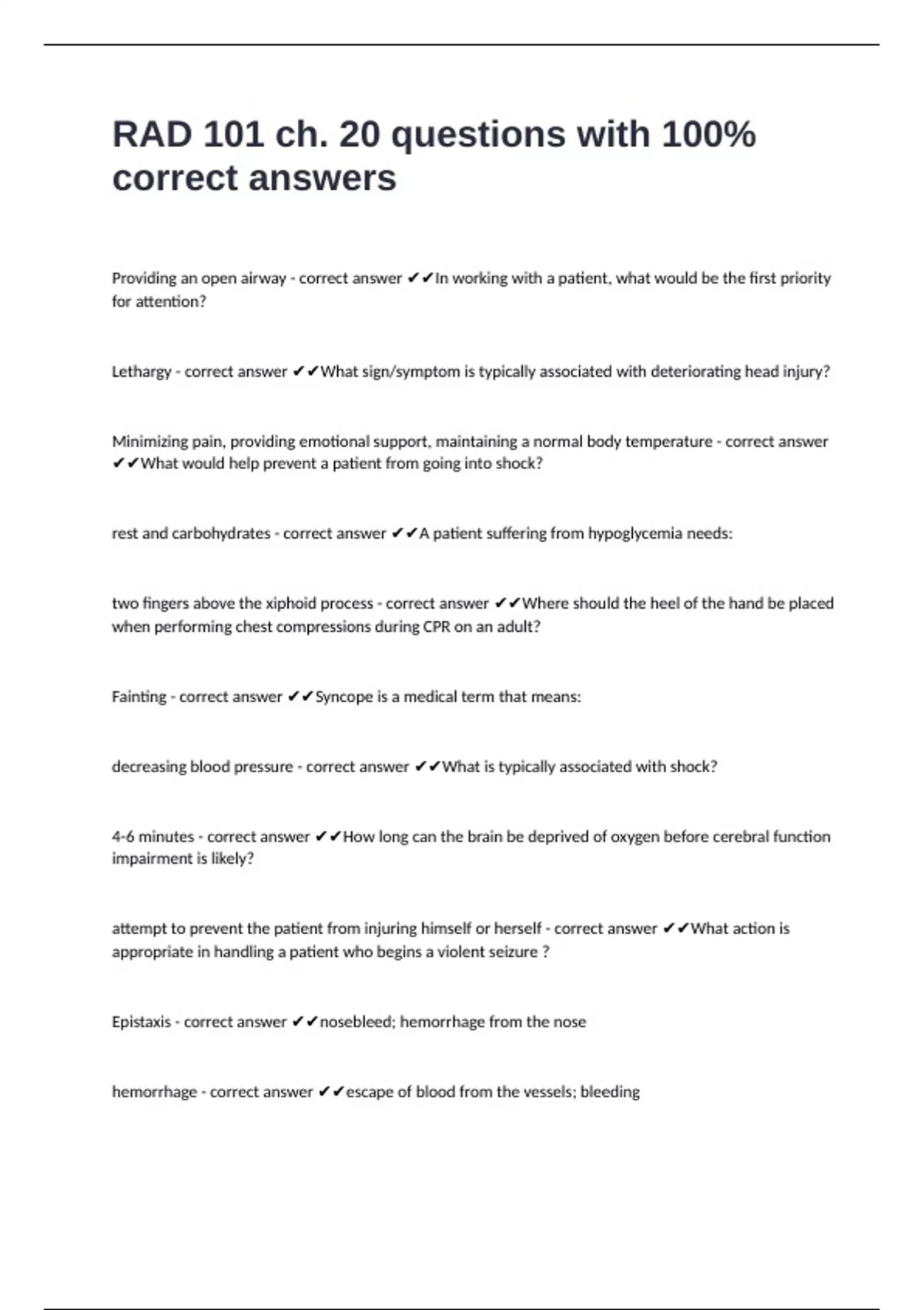 Fainting - correct answer ✔✔Syncope is a medical term that means: