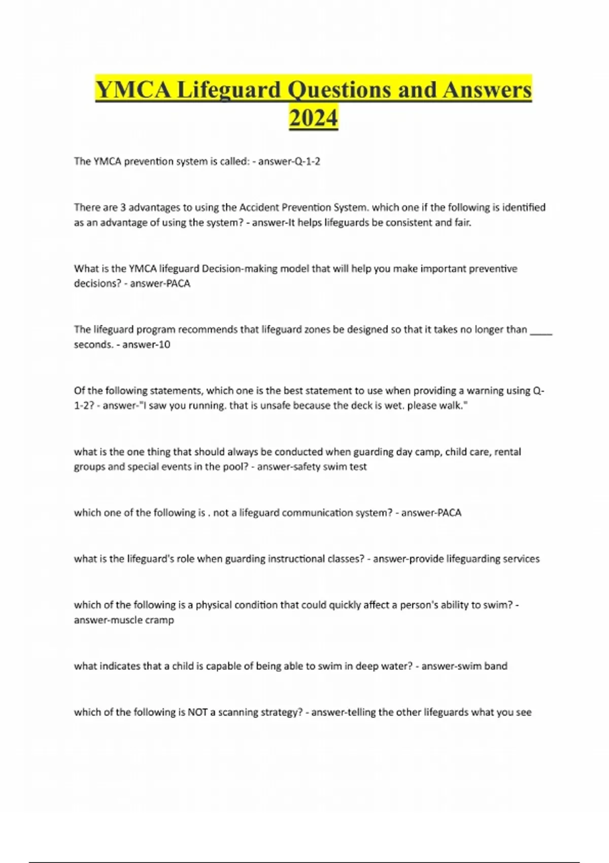 YMCA Lifeguard Questions and Answers 2024 The YMCA prevention system is called: - answer-Q-1-2 There are 3 advantages to using the Accident Prevention System. which one if the following is identified as an advantage of using the system? - answer-It helps lifeguards be consistent and fair. What is the YMCA lifeguard Decision-making model that will help you make important preventive decisions? - answer-PACA The lifeguard program recommends that lifeguard zones be designed so that it takes no longer than ____ seconds. - answer-10 Of the following statements, which one is the best statement to use when providing a warning using Q- 1-2? - answer-"I saw you running. that is unsafe because the deck is wet. please walk." what is the one thing that should always be conducted when guarding day camp, child care, rental groups and special events in the pool? - answer-safety swim test which one of the following is . not a lifeguard communication system? - answer-PACA what is the lifeguard's role when guarding instructional classes? - answer-provide lifeguarding services which of the following is a physical condition that could quickly affect a person's ability to swim? - answer-muscle cramp