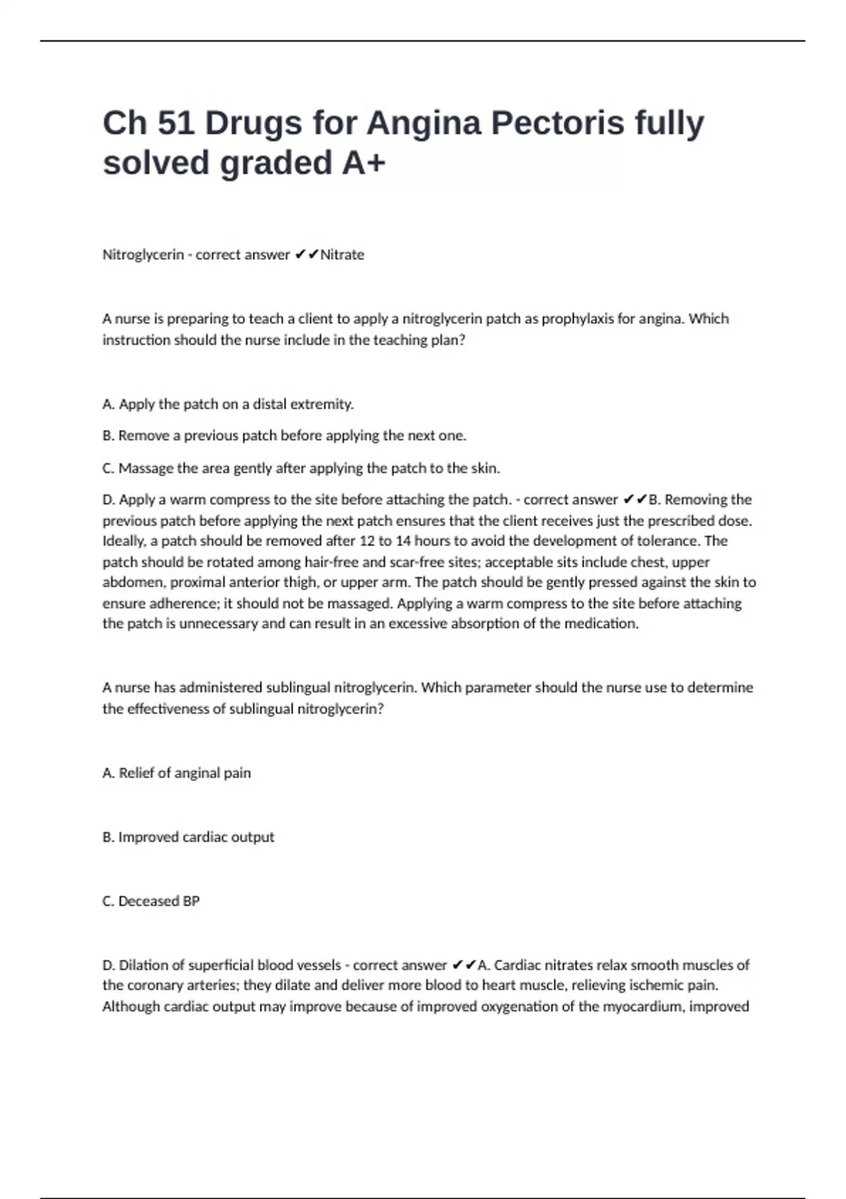 Ch 51 Drugs for Angina Pectoris fully solved graded A+