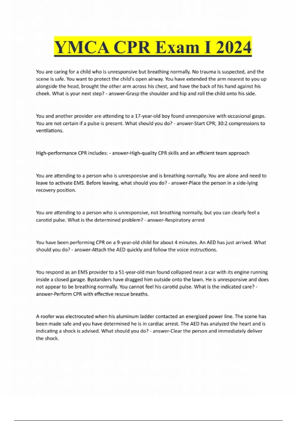 YMCA CPR Exam I 2024 You are caring for a child who is unresponsive but breathing normally. No trauma is suspected, and the scene is safe. You want to protect the child's open airway. You have extended the arm nearest to you up alongside the head, brought the other arm across his chest, and have the back of his hand against his cheek. What is your next step? - answer-Grasp the shoulder and hip and roll the child onto his side. You and another provider are attending to a 17-year-old boy found unresponsive with occasional gasps. You are not certain if a pulse is present. What should you do? - answer-Start CPR; 30:2 compressions to ventilations. High-performance CPR includes: - answer-High-quality CPR skills and an efficient team approach You are attending to a person who is unresponsive and is breathing normally. You are alone and need to leave to activate EMS. Before leaving, what should you do? - answer-Place the person in a side-lying recovery position. You are attending to a person who is unresponsive, not breathing normally, but you can clearly feel a carotid pulse. What is the determined problem? - answer-Respiratory arrest You have been performing CPR on a 9-year-old child for about 4 minutes. An AED has just arrived. What should you do? - answer-Attach the AED quickly and follow the voice instructions.