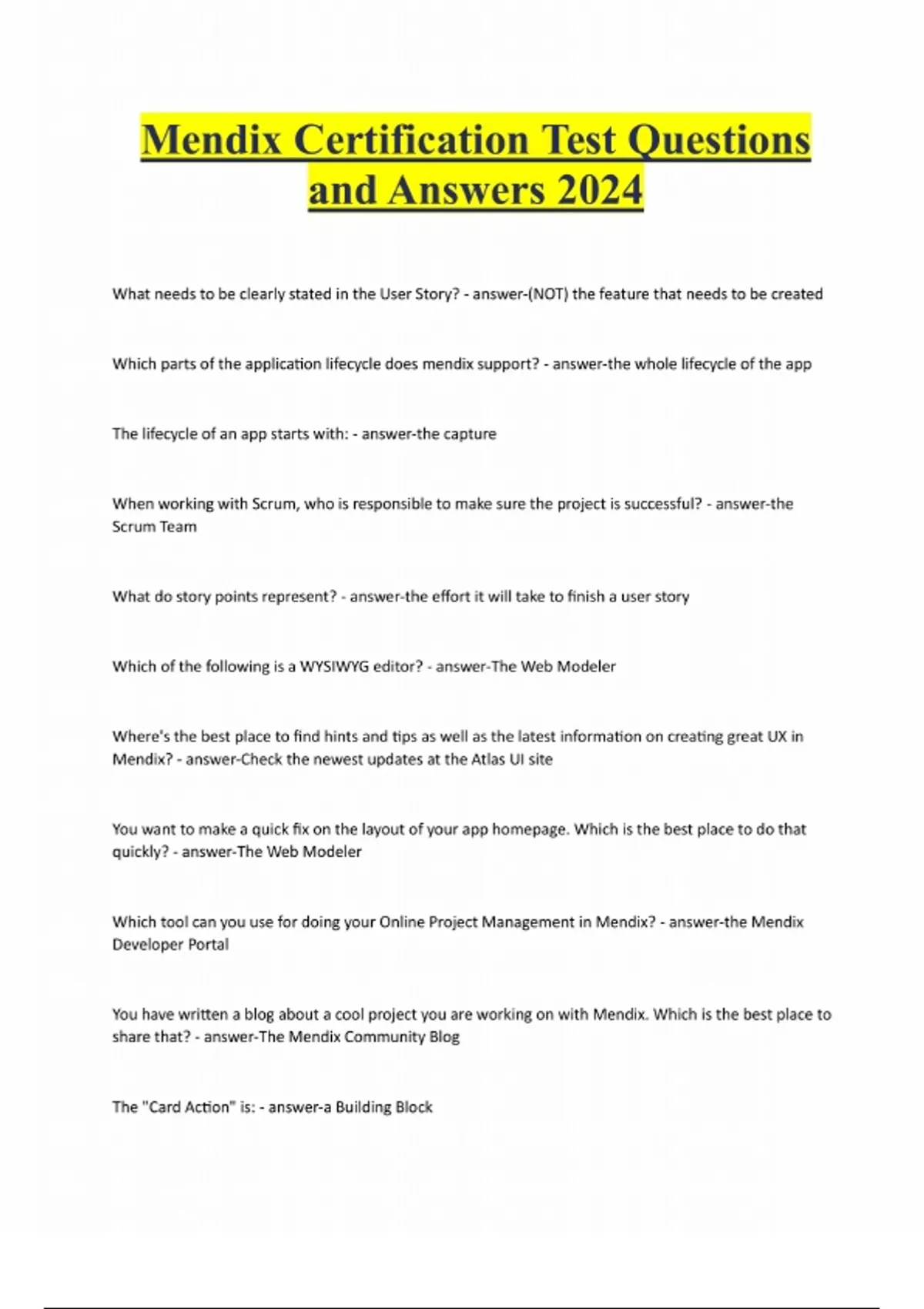 Mendix Certification Test Questions and Answers 2024 What needs to be clearly stated in the User Story? - answer-(NOT) the feature that needs to be created Which parts of the application lifecycle does mendix support? - answer-the whole lifecycle of the app The lifecycle of an app starts with: - answer-the capture When working with Scrum, who is responsible to make sure the project is successful? - answer-the Scrum Team What do story points represent? - answer-the effort it will take to finish a user story Which of the following is a WYSIWYG editor? - answer-The Web Modeler Where's the best place to find hints and tips as well as the latest information on creating great UX in Mendix? - answer-Check the newest updates at the Atlas UI site You want to make a quick fix on the layout of your app homepage. Which is the best place to do that quickly? - answer-The Web Modeler
