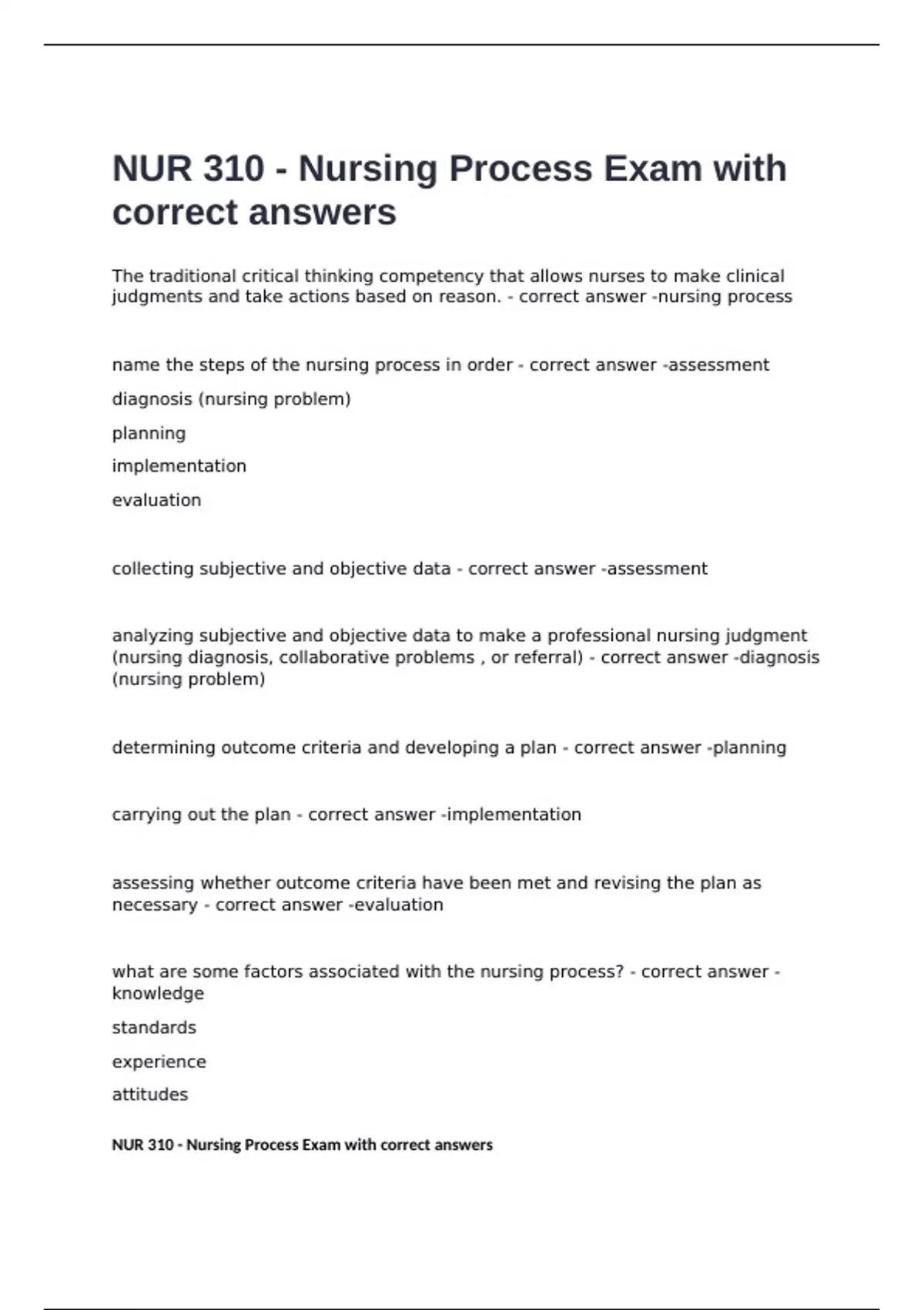 NUR 310 - Nursing Process Exam with correct answers.