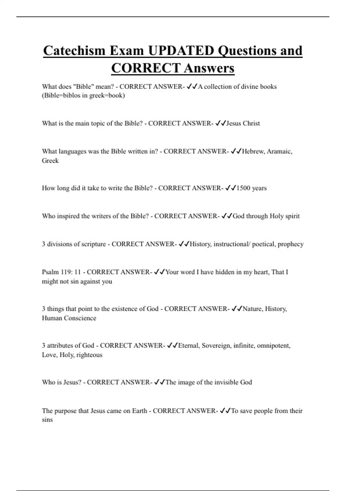 Catechism Exam UPDATED Questions and CORRECT Answers What does "Bible" mean? - CORRECT ANSWER- A collection of divine books (Bible=biblos in greek=book) What is the main topic of the Bible? - CORRECT ANSWER- Jesus Christ What languages was the Bible written in? - CORRECT ANSWER- Hebrew, Aramaic, Gree