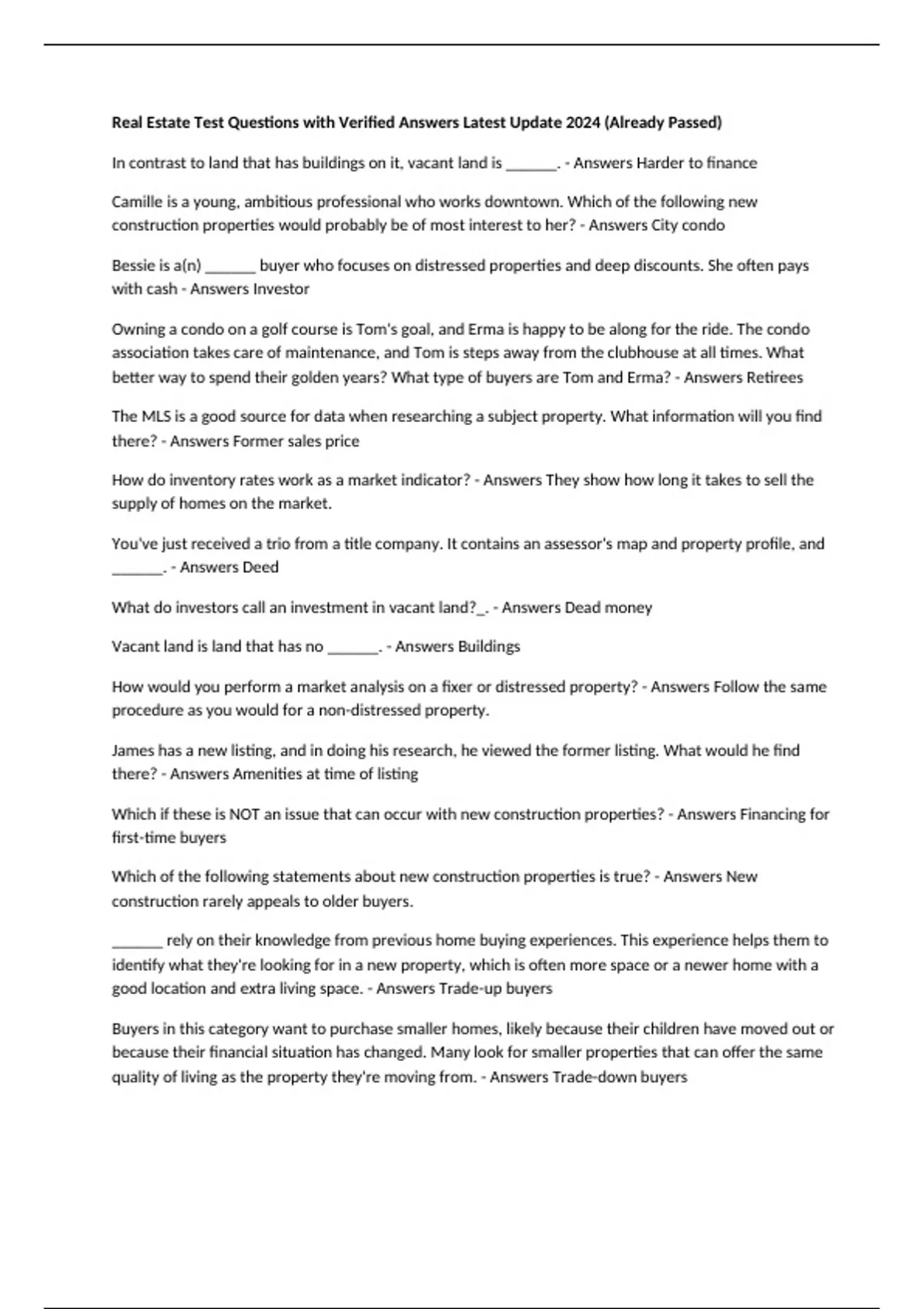 Real Estate Test Questions with Verified Answers Latest Update 2024 (Already Passed) In contrast to land that has buildings on it, vacant land is ______. - Answers Harder to finance Camille is a young, ambitious professional who works downtown. Which of the following new construction properties would probably be of most interest to her? - Answers City condo Bessie is a(n) ______ buyer who focuses on distressed properties and deep discounts. She often pays with cash - Answers Investor Owning a condo on a golf course is Tom's goal, and Erma is happy to be along for the ride. The condo association takes care of maintenance, and Tom is steps away from the clubhouse at all times. What better way to spend their golden years? What type of buyers are Tom and Erma? - Answers Retirees The MLS is a good source for data when researching a subject property. What information will you find there? - Answers Former sales price How do inventory rates work as a market indicator? - Answers They show how long it takes to sell the supply of homes on the market. You've just received a trio from a title company. It contains an assessor's map and property profile, and ______. - Answers Deed What do investors call an investment in vacant land?_. - Answers Dead money Vacant land is land that has no ______. - Answers Buildings How would you perform a market analysis on a fixer or distressed property? - Answers Follow the same procedure as you would for a non-distressed property. James has a new listing, and in doing his research, he viewed the former listing. What would he find there? - Answers Amenities at time of listing Which if these is NOT an issue that can occur with new construction properties? - Answers Financing for first-time buyers Which of the following statements about new construction properties is true? - Answers New construction rarely appeals to older buyers. ______ rely on their knowledge from previous home buying experiences. This experience helps them to identify what they're looking for in a new property, which is often more space or a newer home with a good location and extra living space. - Answers Trade-up buyers Buyers in this category want to purchase smaller homes, likely because their children have moved out or because their financial situation has changed. Many look for smaller properties that can offer the same quality of living as the property they're moving from. - Answers Trade-down buyers Which of the following is one of the primary reasons that developers like to invest in unimproved land? - Answers It's easier to build on a blank canvas than it is to retrofit existing infrastructure. ______ often have a fixed income, but they may have large down payments from selling prior homes. Accessible properties with little to no maintenance tend to be attractive to these buyers. - Answers Retirees You've just received a potential listing referral from a licensee friend in another city. Besides calling the sellers, what's one thing you can do right at the beginning to start getting a feel for the property? - Answers Check Google Maps to get an idea of the property's street view, landscaping, lot privacy, and neighboring properties. These types of buyers want to purchase larger or newer homes. They're fairly knowledgeable because they've purchased before. - Answers Trade-up buyers Which of the following information can be found in a subject property's former listing on the MLS? - Answers Amenities at time of listing Misti, your client, is looking at a three-bedroom, two-bathroom home in a brand new suburban neighborhood. Misti is a young professional who works downtown. What do you tell her? - Answers "You'll want to get a home inspection, even though it's new construction." Owner-occupied fixers requiring major work may be eligible for ______. - Answers Rehabilitation loans Clem, a licensee, told his buyers of a new construction property that they wouldn't have to worry about a home inspection. Is this correct? - Answers No. New construction may have repair issues. Which of the following may be the result of building delays on a new construction? - Answers A delay in closing Bessie is a(n) ______ buyer who focuses on distressed properties and deep discounts. She often pays with cash. - Answers Investor Percy wants to buy unimproved land. When he contacted his lender, he was surprised to find that he would need a 50% down payment. Why is that? - Answers There's more risk financing unimproved land. You can't move land, and location plays a huge role in the value of real estate. This refers to the ______ of the real estate market. - Answers Immobility Shane is preparing a CMA. He may need to make an adjustment to a comparable for which item of difference from the subject property? - Answers Busy street A buyer has assembled quite a list of repairs he'd like the seller to make. The seller, fearing she might lose this buyer, agrees to every item on the list. In what type of market is this concern most valid? - Answers cold Larry is buying a new home and he makes an offer that's quite a bit under list price. The seller, fearing she might lose this buyer, agrees to Larry's offer. In what type of market is this concern most valid? - Answers cold Price levels are an obvious indicator of ______. - Answers demand Home affordability is affected by government controls and policies, such as ______. - Answers Interest rates, property tax rates, and the availability of funds for loans What makes real estate unique? - Answers Indestructability When your broker explains market value, she would be correct to state what? - Answers "It's the probable sales price if the property were listed today and a willing seller and buyer were involved in the transfer of ownership." Which of these is the correct definition for market value? - Answers The probable price at which a willing seller and a willing buyer, neither of whom are under undue pressure, would transact a sale in a competitive and open market Which of thes