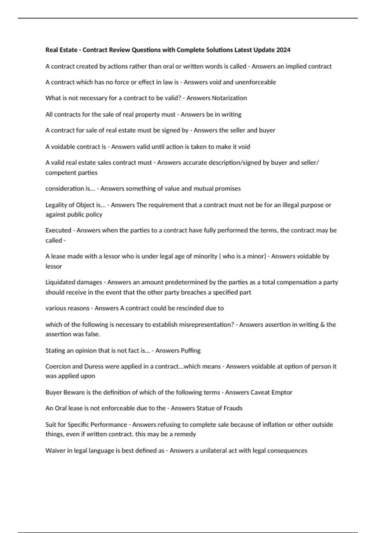 Real Estate - Contract Review Questions with Complete Solutions Latest Update 2024