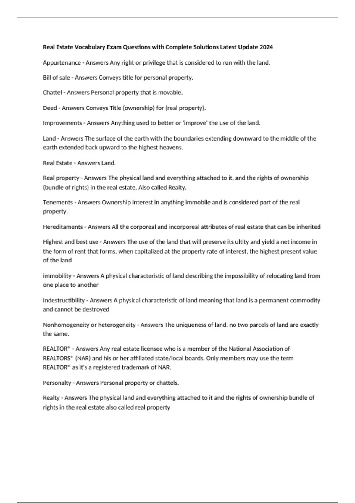 Realty - Answers The physical land and everything attached to it and the rights of ownership bundle of