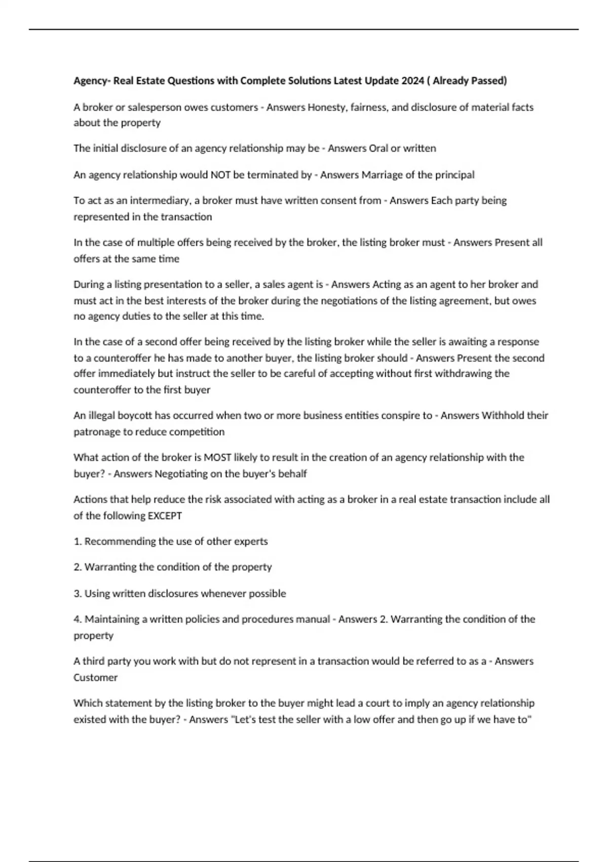 Agency- Real Estate Questions with Complete Solutions Latest Update 2024 ( Already Passed)