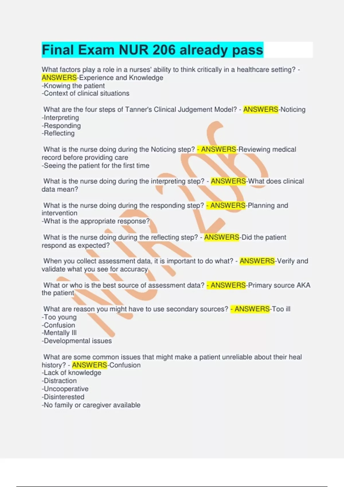 Final Exam NUR 206 already pass What factors play a role in a nurses' ability to think critically in a healthcare setting? - ANSWERS-Experience and Knowledge -Knowing the patient -Context of clinical situations What are the four steps of Tanner's Clinical Judgement Model? - ANSWERS-Noticing -Interpreting -Responding -Reflecting What is the nurse doing during the Noticing step? - ANSWERS-Reviewing medical record before providing care -Seeing the patient for the first time What is the nurse doing during the interpreting step? - ANSWERS-What does clinical data mean? What is the nurse doing during the responding step? - ANSWERS-Planning and intervention -What is the appropriate response? What is the nurse doing during the reflecting step? - ANSWERS-Did the patient respond as expected? When you collect assessment data, it is important to do what? - ANSWERS-Verify and validate what you see for accuracy What or who is the best source of assessment data? - ANSWERS-Primary source AKA the patient What are reason you might have to use secondary sources? - ANSWERS-Too ill -Too young -Confusion -Mentally Ill -Developmental issues What are some common issues that might make a patient unreliable about their heal history? - ANSWERS-Confusion -Lack of knowledge -Distraction -Uncooperative -Disinterested -No family or caregiver available What are some common issues an older person might have that complicate a patient assessment? - ANSWERS-Sensory problems -Tire more easily -Mental health -Disinterest -Tactile issues How could you adapt the assessment to help? - ANSWERS-Go at a slower pace -Speak clearly -Be attentive -Could use caregiver or family What is subjective data? - ANSWERS-A patient's verbal description of their health/health problems What is objective data? - ANSWERS-Findings resulted from direct observation Name five ways to promote therapeutic communication - ANSWERS-Be prepared -Being courteous -Comfort -Connection -Confirmation What is the best way to know about your patient's specific cultural needs? - ANSWERS-Ask Give an example of how to document a chief complaint for a patient - ANSWERS-Pt complains of right lower quadrant abdominal pain and is reason for seeking care. An emergency situation, what are the three most important assessments? - ANSWERS-Airway -Breathing -Circulation -Addition of: Disability and exposure Name three rules about charting/documenting care. - ANSWERS-If you did not chart it, it was not done -Clear and concise -Use appropriate medical terminology What are the three types of nursing diagnoses/diagnostic statements? - ANSWERS-Problem-focused -Risk diagnosis -Health promotion