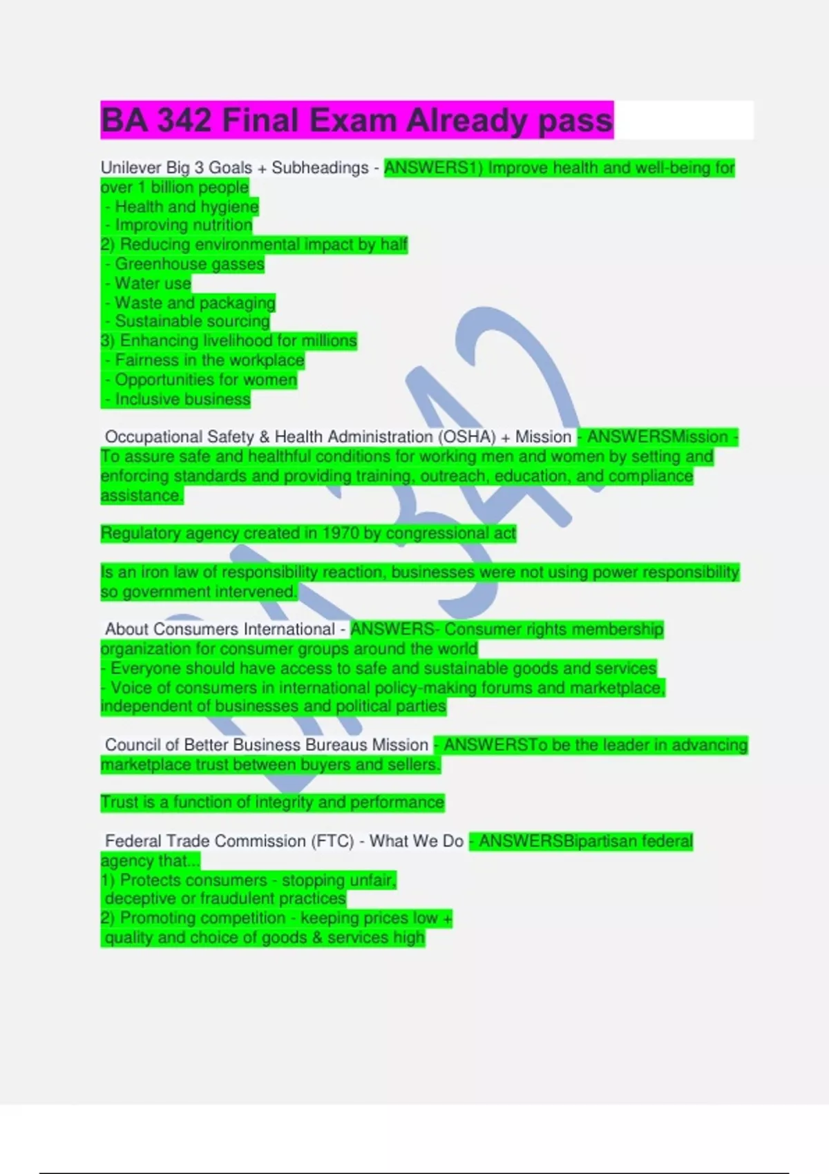 BA 342 Final Exam Already pass Unilever Big 3 Goals + Subheadings - ANSWERS1) Improve health and well-being for over 1 billion people - Health and hygiene - Improving nutrition 2) Reducing environmental impact by half - Greenhouse gasses - Water use - Waste and packaging - Sustainable sourcing 3) Enhancing livelihood for millions - Fairness in the workplace - Opportunities for women - Inclusive business Occupational Safety & Health Administration (OSHA) + Mission - ANSWERSMission - To assure safe and healthful conditions for working men and women by setting and enforcing standards and providing training, outreach, education, and compliance assistance. Regulatory agency created in 1970 by congressional act Is an iron law of responsibility reaction, businesses were not using power responsibility so government intervened. About Consumers International - ANSWERS- Consumer rights membership organization for consumer groups around the world - Everyone should have access to safe and sustainable goods and services - Voice of consumers in international policy-making forums and marketplace, independent of businesses and political parties Council of Better Business Bureaus Mission - ANSWERSTo be the leader in advancing marketplace trust between buyers and sellers. Trust is a function of integrity and performance Federal Trade Commission (FTC) - What We Do - ANSWERSBipartisan federal agency that... 1) Protects consumers - stopping unfair, deceptive or fraudulent practices 2) Promoting competition - keeping prices low + quality and choice of goods & services high 6 Things that the Consumer Product Safety Commission (CPSC) does - ANSWERS1) Developing voluntary standards with standards organizations, manufacturers and businesses 2) Issuing and enforcing mandatory standards or banning consumer products if no feasible standard would adequately protect the public 3) Obtaining the recall of products and arranging for a repair, replacement or refund for recalled products 4) Researching potential product hazards 5) Informing and educating consumers directly and through traditional, online, and social media and by working with foreign, state and local governments and private organizations 6) Educating manufacturers worldwide about our regulations, supply chain integrity and development of safe products Language Check - ANSWERS50% of companies say "Sustainability' 25% of companies say "Corporate Social Responsibility" usually banks 25% of companies say other things like citizenship CSR & You - 3 things to be a corporate leader - ANSWERS1) Can you manage money? 2) Can you manage people? 3) What have you done in social responsibility? B Lab Shareholder vs Stakeholder, Warby Parker - ANSWERSB Lab is a certification group that gives certification to companies that meet the highest standards of... - social & environmental performance, - public transparency - legal accountability B Corp - "Benefits Corporation" Shareholder - 20th century old view Stakeholder - 21st century view; social & environmental problems can be solves through businesses, make money + make a difference