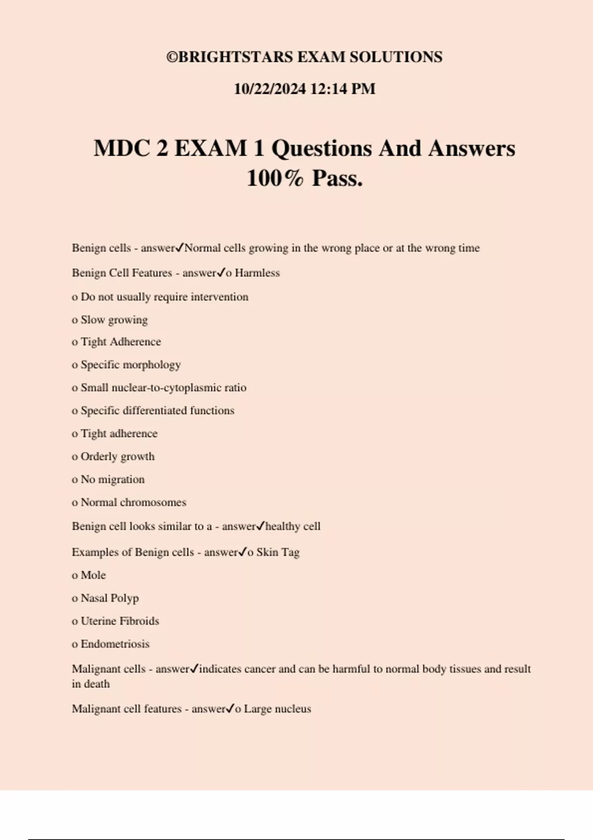 MDC 2 EXAM 1 Questions And Answers 100% Pass. Benign cells - answerNormal cells growing in the wrong place or at the wrong time Benign Cell Features - answero Harmless o Do not usually require intervention o Slow growing o Tight Adherence o Specific morphology o Small nuclear-to-cytoplasmic ratio o Specific differentiated functions o Tight adherence o Orderly growth o No migration o Normal chromosomes Benign cell looks similar to a - answerhealthy cell Examples of Benign cells - answero Skin Tag o Mole o Nasal Polyp o Uterine Fibroids o Endometriosis Malignant cells - answerindicates cancer and can be harmful to normal body tissues and result in death Malignant cell features - answero Large nucleus ©BRIGHTSTARS EXAM SOLUTIONS 10/22/2024 12:14 PM o Migration o Doesn't stop and replicates (No contact inhibition) o Loose adherence o Rapid or continuous cell division o Loss of cellular regulation o Abnormal chromosomes (< or > 23) Seven warning signs of cancer - answero C-Change in bowel or bladder patterns o A-A sore that doesn't heal o U-Unusual bleeding or d/c o. T-Thickening or lump on breast or elsewhere o I-Indigestion or difficulty swallowing o O-Obvious change in wart or mole o N-Nagging cough or hoarseness Cancer development stages of malignancy - answero Initiation o Promotion o Progression o Metastasis Initiation (Stage of malignancy) - answerNormal cells are damaged and irreversible Promotion - answerRepeated exposure>Enhances growth of malignant cells Progression - answerIncrease in production of malignant cells Metastasis - answerCells move from primary site to the rest of the body Carcinogenesis/oncogenesis - answercancer development Cancer classification - answero Grading o Ploidy o Staging ©BRIGHTSTARS EXAM SOLUTIONS 10/22/2024 12:14 PM o TNM o Doubling time and mitotic index Grading - answerLooking under microscope and determine level/degree of mutation of cancer cell from normal cells o Ex. 1= No mutation o 4= Severe mutation Ploidy - answerNumber of chromosomes Staging - answerHow large is the primary tumor and how far has it spread TNM - answero T-Tumor (How large is primary or 2nd) o N- Node (Are regional lymph nodes invaded by cancer cell) o M-Metastasis (0=None, 1=There is metastasis) Doubling time and mitotic index - answerPeriod of time required for that quantity to double in size (Tells how aggressive cancer grows) o Stage 1=Localized o Stage 4= Spread across the body Cancer prevention primary - answero Sunscreen o Avoid smoking o Removal of "at risk" tissue (mole) o Chemoprevention o Vaccine (HPV) Cancer prevention secondary - answero Mammogram o Pap smear o Prostate test Cancer prevention tertiary - answerPe