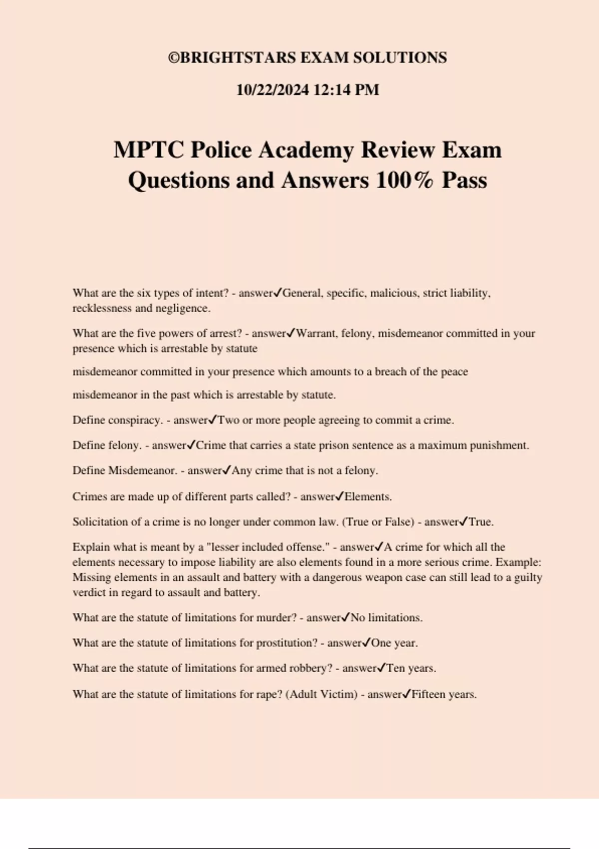 MPTC Police Academy Review Exam Questions and Answers 100% Pass What are the six types of intent? - answerGeneral, specific, malicious, strict liability, recklessness and negligence. What are the five powers of arrest? - answerWarrant, felony, misdemeanor committed in your presence which is arrestable by statute misdemeanor committed in your presence which amounts to a breach of the peace misdemeanor in the past which is arrestable by statute. Define conspiracy. - answerTwo or more people agreeing to commit a crime. Define felony. - answerCrime that carries a state prison sentence as a maximum punishment. Define Misdemeanor. - answerAny crime that is not a felony. Crimes are made up of different parts called? - answerElements. Solicitation of a crime is no longer under common law. (True or False) - answerTrue. Explain what is meant by a "lesser included offense." - answerA crime for which all the elements necessary to impose liability are also elements found in a more serious crime. Example: Missing elements in an assault and battery with a dangerous weapon case can still lead to a guilty verdict in regard to assault and battery. What are the statute of limitations for murder? - answerNo limitations. What are the statute of limitations for prostitution? - answerOne year. What are the statute of limitations for armed robbery? - answerTen years. What are the statute of limitations for rape? (Adult Victim) - answerFifteen years.