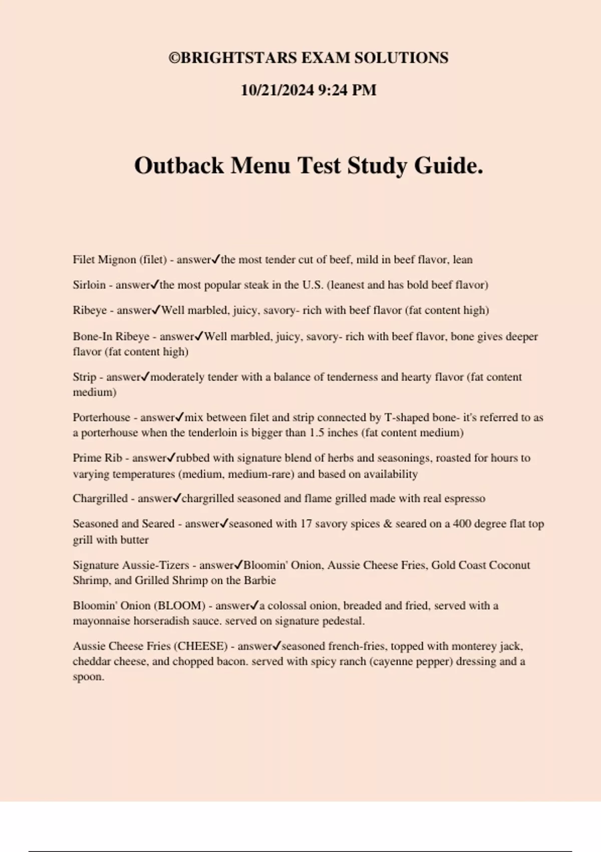 Outback Menu Test Study Guide. Filet Mignon (filet) - answerthe most tender cut of beef, mild in beef flavor, lean Sirloin - answerthe most popular steak in the U.S. (leanest and has bold beef flavor) Ribeye - answerWell marbled, juicy, savory- rich with beef flavor (fat content high) Bone-In Ribeye - answerWell marbled, juicy, savory- rich with beef flavor, bone gives deeper flavor (fat content high) Strip - answermoderately tender with a balance of tenderness and hearty flavor (fat content medium) Porterhouse - answermix between filet and strip connected by T-shaped bone- it's referred to as a porterhouse when the tenderloin is bigger than 1.5 inches (fat content medium) Prime Rib - answerrubbed with signature blend of herbs and seasonings, roasted for hours to varying temperatures (medium, medium-rare) and based on availability Chargrilled - answerchargrilled seasoned and flame grilled made with real espresso Seasoned and Seared - answerseasoned with 17 savory spices & seared on a 400 degree flat top grill with butter Signature Aussie-Tizers - answerBloomin' Onion, Aussie Cheese Fries, Gold Coast Coconut Shrimp, and Grilled Shrimp on the Barbie Bloomin' Onion (BLOOM) - answera colossal onion, breaded and fried, served with a mayonnaise horseradish sauce. served on signature pedestal. Aussie Cheese Fries (CHEESE) - answerseasoned french-fries, topped with monterey jack, cheddar cheese, and chopped bacon. served with spicy ranch (cayenne pepper) dressing and a spoon. ©BRIGHTSTARS EXAM SOLUTIONS 10/21/2024 9:24 PM Kookaburra Wings (WINGS MILD, MED OR HOT) - answerone pound (10 wings on average) of fresh chicken wings breaded and deep fried, served with celery and homemade blue cheese dressing (mild, medium, or hot) Grilled Shrimp on the Barbie (GSB) - answer8 seasoned shrimp with a special blend of herbs & spices then flame-grilled. served with garlic toast and remoulade sauce. Sydney's Shrooms (SYDNEY SHROOMS) - answerlightly battered and fried button mushrooms served with house-made ranch dressing for dipping Aussie Twisted Ribs (TWISTED RIBS) - answer4 tender baby back ribs, fried Outback-style, then tossed in tangy BBQ sauce and drizzled with our spicy signature bloom sauce. Garnished with spicy house-made pickles. Seared Peppered Ahi (AHI APP) - answersashimi grade ahi tuna, seared rare with garlic pepper seasoning. served over a bed of chopped salad mix and crispy noodles. drizzled with creamy soy ginger sauce and served with a ginger and wasabi. Gold Coast Coconut Shrimp (COCO) - answer8 large shrimp dipped in beer batter, rolled in coconut and then fried golden. served with creole-orange marmalade sauce. Steakhouse Mac & Cheese Bites (8 MAC BITES) - answer8 mac & cheese bites filled with macaroni and mozzarella, asiago & parmesan cheese. served with a side of our homemade spicy ranch dressing. Three Cheese Steak Dip (STEAK SKILLET) - answera blend of steak, gouda, parmesan and jack cheeses, red bell pepper and onions. served with a spoon and tortilla chips for dipping. Ranch - answerR Blue Cheese - answerBC Honey Mustard - answerHM Thousand Island - answer1000 Tangy Tomato (Fat Free) - answerT Light Balsamic Vinaigrette - answerLBV Mustard Vinaigrette (house) - answerMV Blue Cheese Vinaigrette - answerBCV