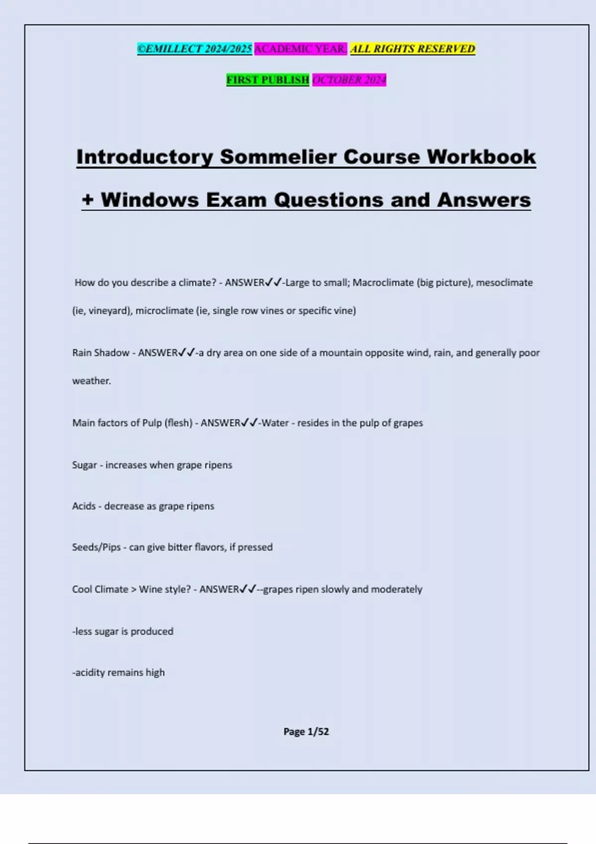 Cool Climate > Wine style? - ANSWER✔✔--grapes ripen slowly and moderately