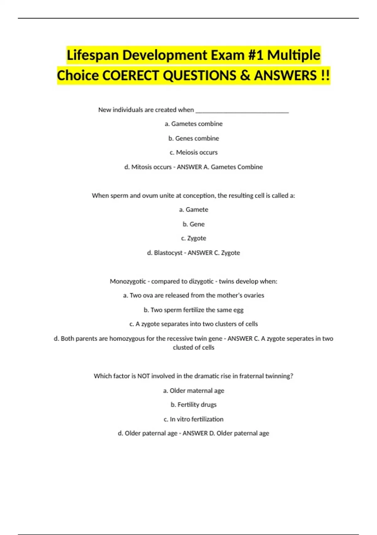 d. Both parents are homozygous for the recessive twin gene - ANSWER C. A zygote seperates in two