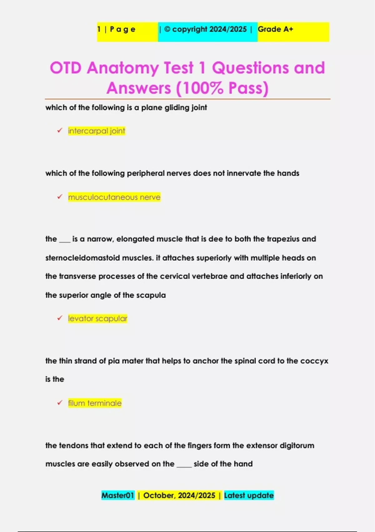 OTD Anatomy Test 1 Questions and Answers (100% Pass)