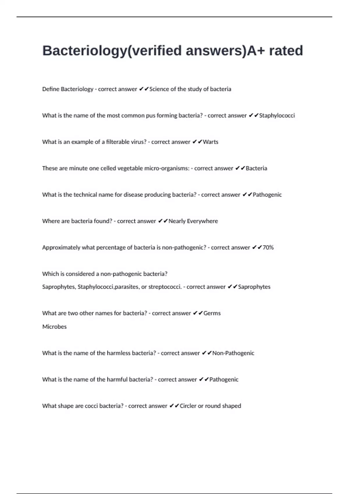 Define Bacteriology - correct answer ✔✔Science of the study of bacteria